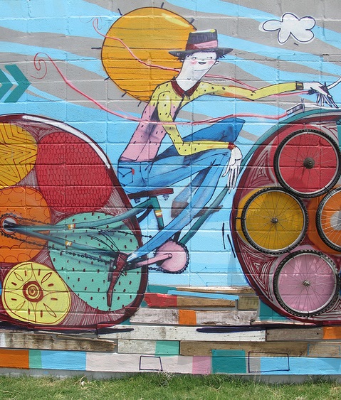 His work is often characterized as “bicycle-themed” art. Maybe it’s because he started so young that his works nearly always include bikes; whimsical, cheery ones. If it really is the age at which he started that directed his theme, I guess we should be grateful he didn’t decide to paint boobs instead.