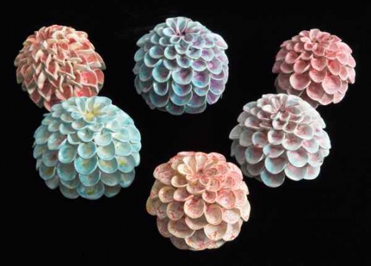 I love the whimsy in her work, but I would especially love to own one or a series of the zinnia-dahlias. I’d be able to dust those!