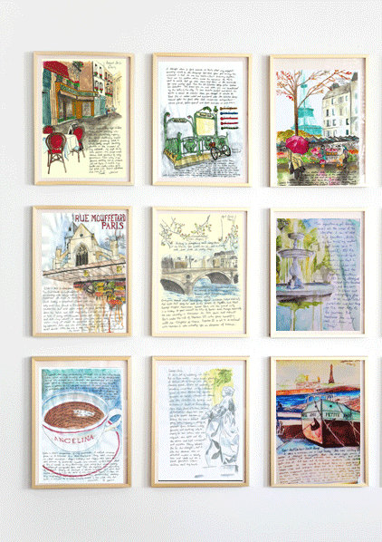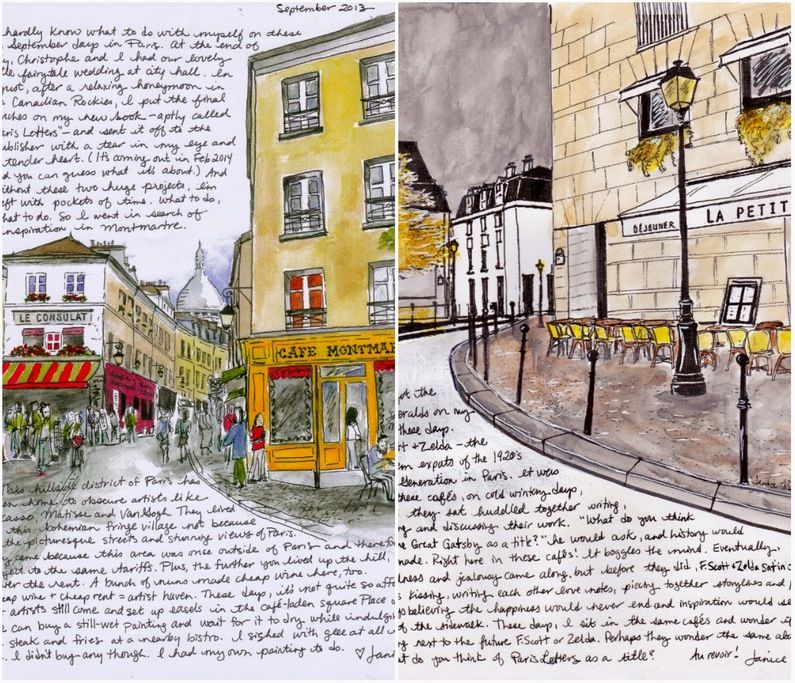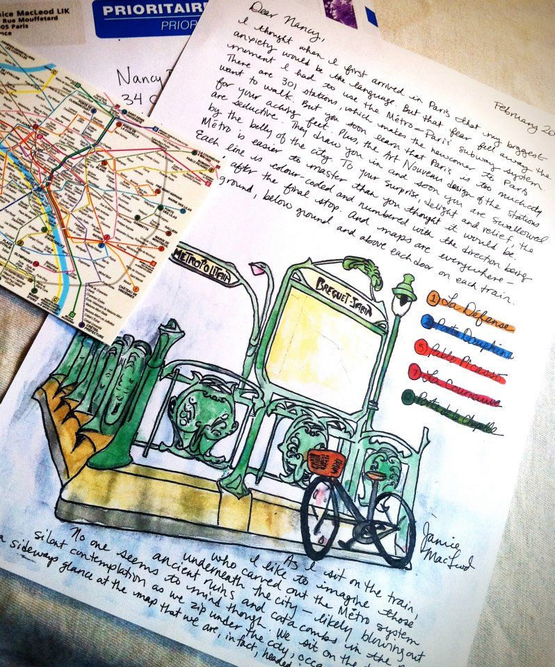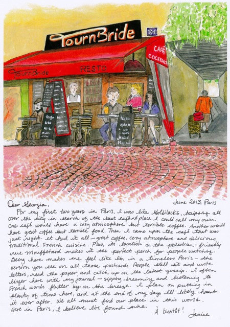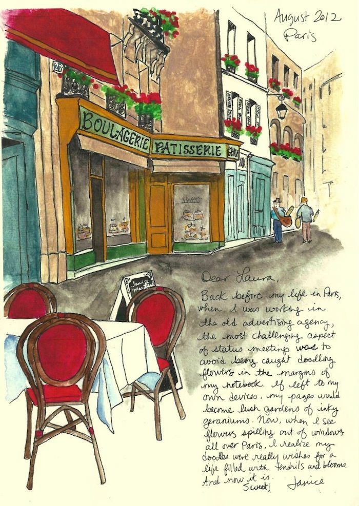 This started out being a post about a great idea, some very appealing art, and a lovely gift that my mother would have loved. But the more I read about Janice MacLeod, the more interested I became in her story. Janice is an artist, writer, and Etsy seller who had a really brilliant idea. Every month, she paints a watercolor of Paris, where she resides. Then she writes a charming and personable letter over the painting, makes a few limited-edition high-quality copies, personalizes each one, and mails them to her subscribers. This may not sound like much, but these letters are really very special. And often, the letters include a little bonus: