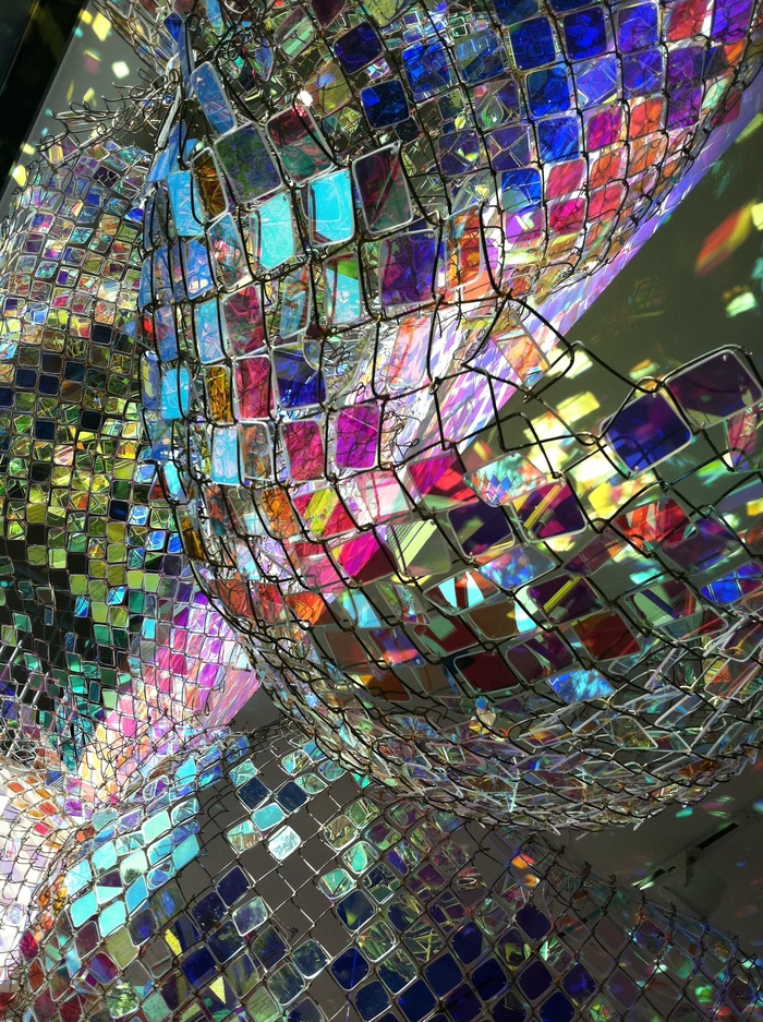 Artist Soo Sunny Park has created this spectacular installation using 37 sections of fencing and thousands of plexiglass squares which send colorful patterns all over the room. The patterns shift with the sun, so that it’s a constantly-evolving light show all day long.