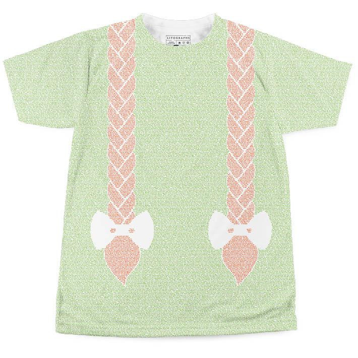 As much as I love their temporary tattoos, when I started to look at their t-shirts, I fell even harder for this creative company. I think it’s so interesting that their tattoos are textual while their shirts, which medium I would have expected to be more conducive to text-based designs, are instead graphic representations of the books they represent. However, if you look closely at the graphics, they’re composed entirely of excerpts of the books they represent. Remarkably smart design! I’ve included a few of those below as well.