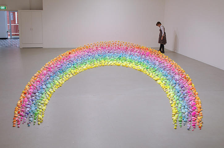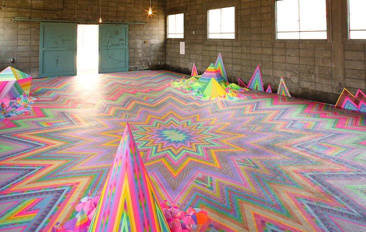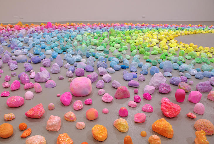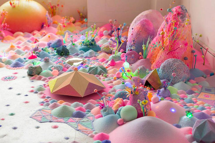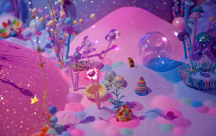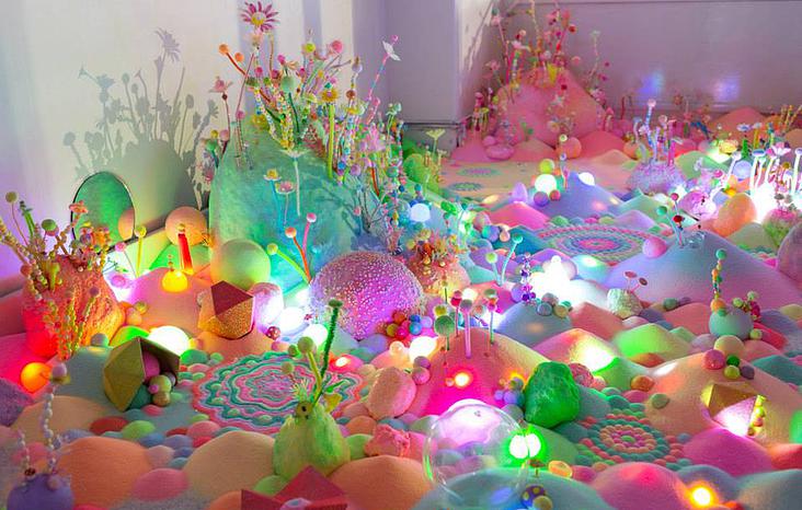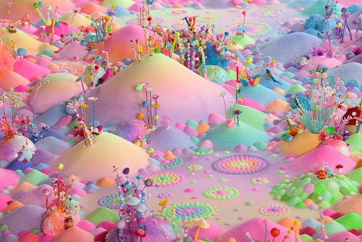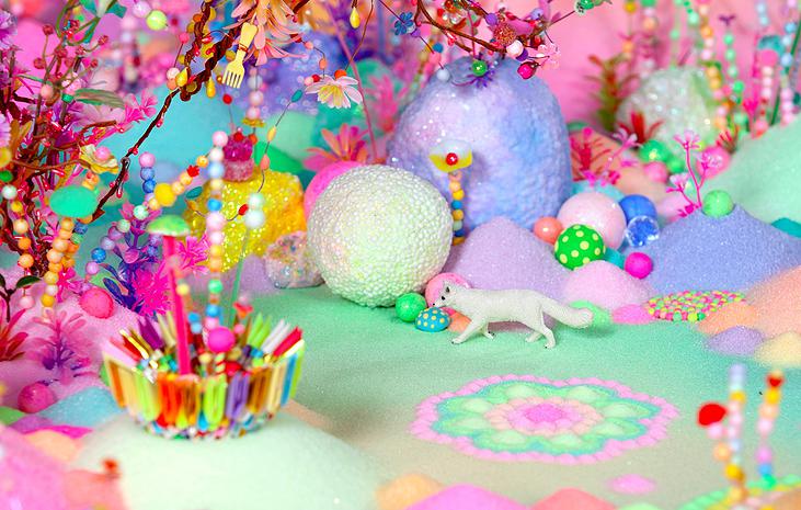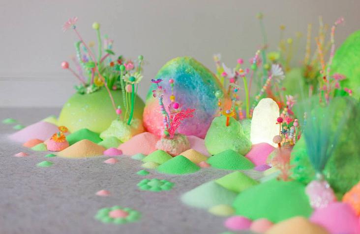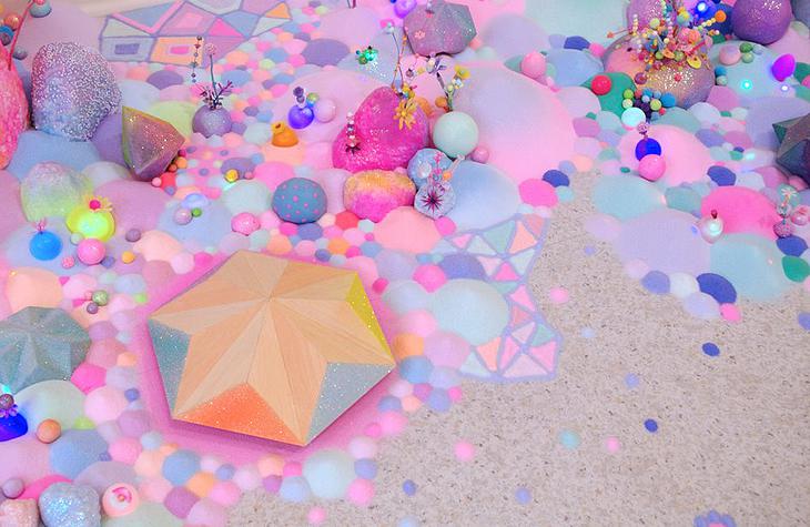 Sugar, glitter, colored sand, candies, pipe cleaners, tiny plastic figurines: her list of materials reads like the shopping list for a 3-year-old’s birthday party, but her results are much more child-like than childish. Her level of precision and attention to detail is off the charts, and her creations really are lovely in a Katy Perry/bubblegum kind of way. I’m also really impressed by the sheer sweeping scale of her installations. Most of them fill a room, or, in the case of her collaboration with fashion label Romance Was Born, an entire stage.
