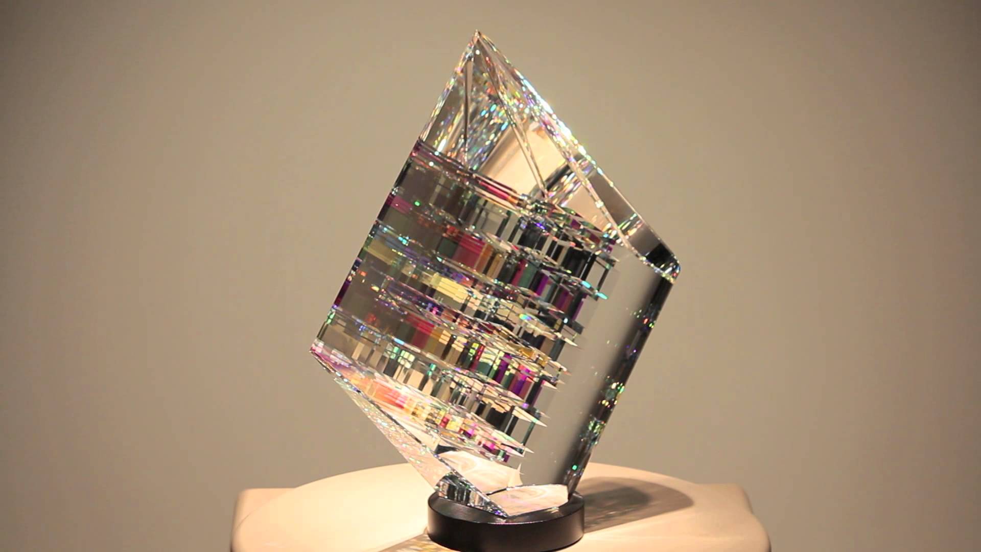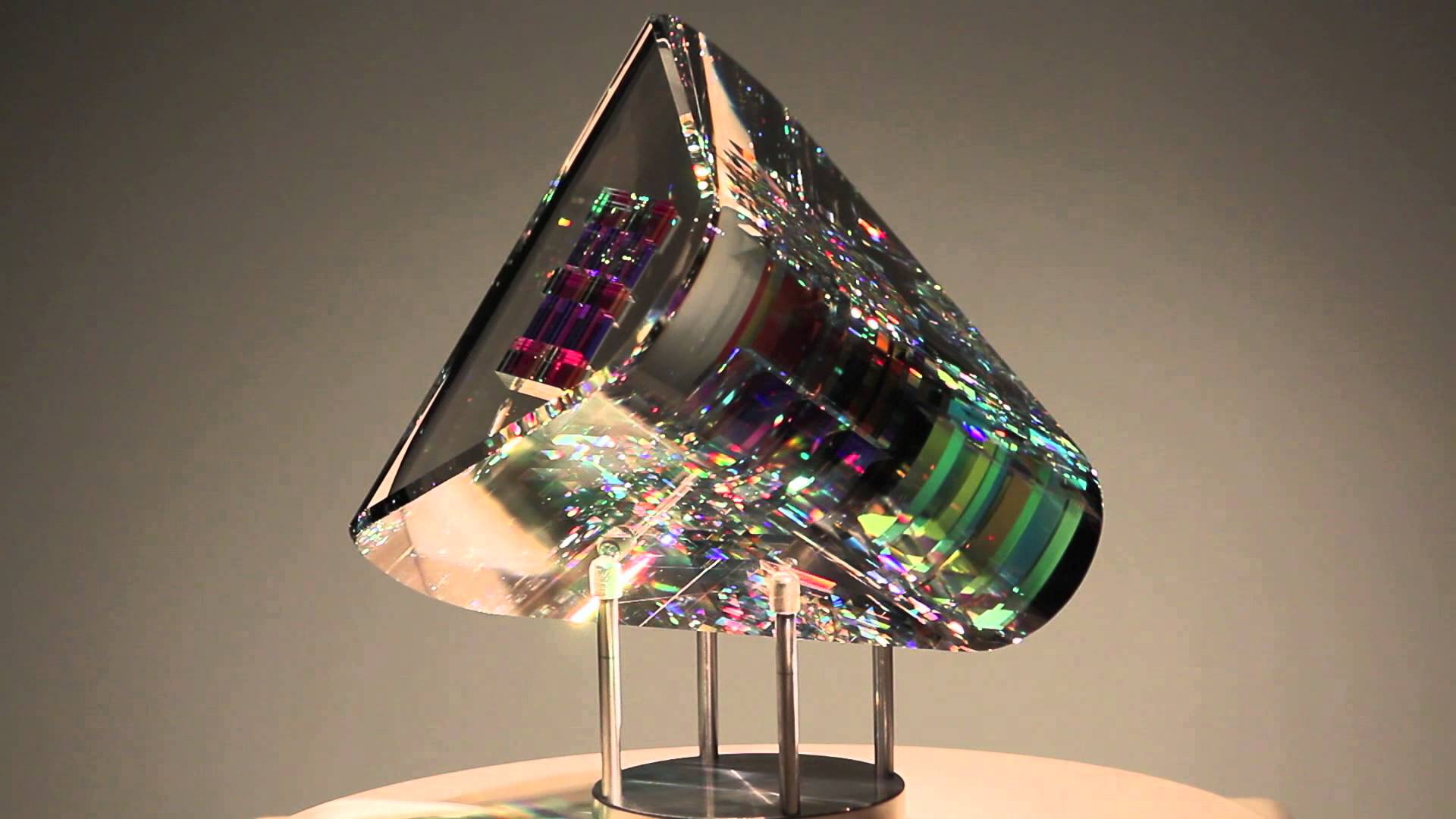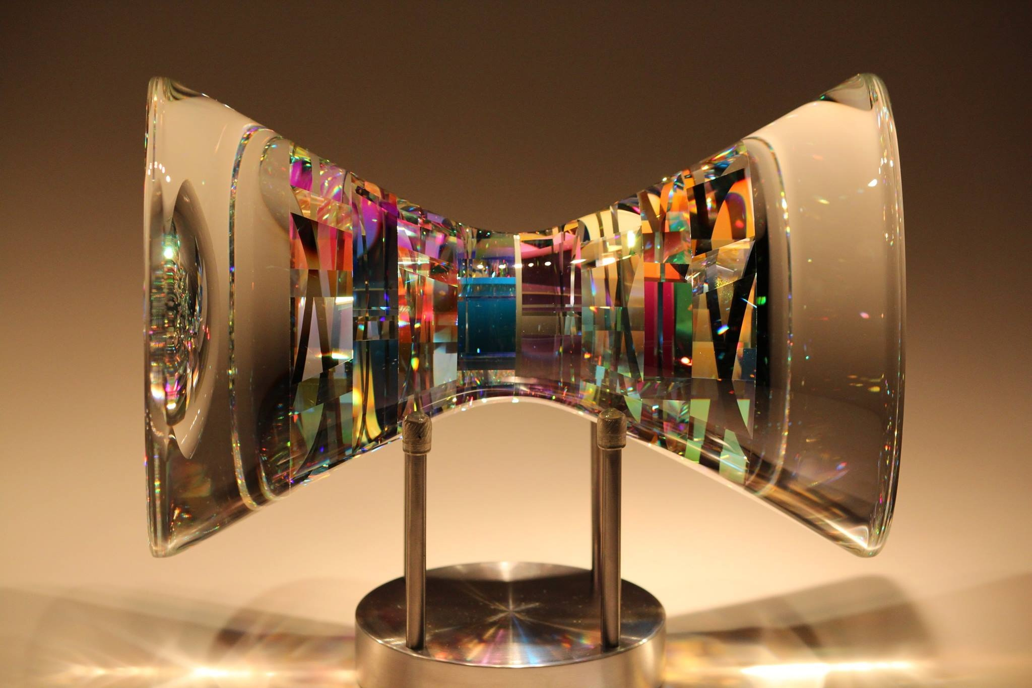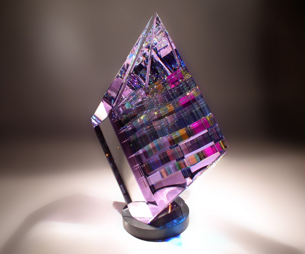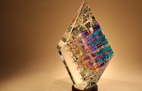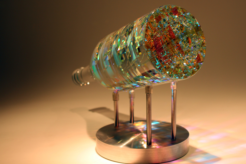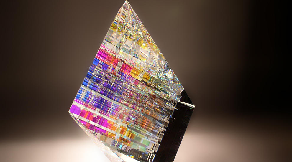 Like the glass sculptures by Jiyong Lee I wrote about last week in “Through the Looking Glass,” Storms uses cold glass-working methods to create his work, but the results are dramatically different. Where Lee’s pieces were smooth and almost gelatinous-looking, Storms’ work seems almost too perfect, too intensely reflective to be produced by human hands. They look like Borg art. Storms merges lead crystal and dichroic glass using a cold-glass process which involves sculpting and grinding and laminating and herculean strength and Job-like patience. One piece can take up to 24 weeks from start to finish. These are true labors of love, and I am utterly captivated by them.