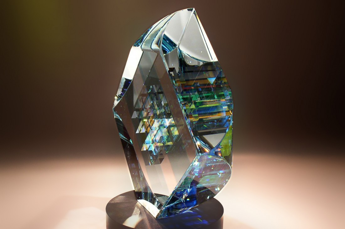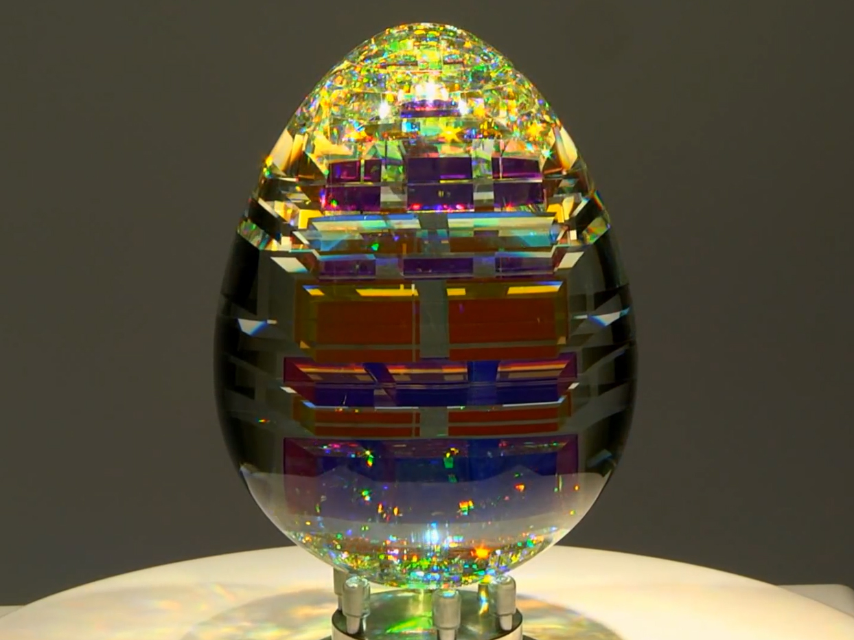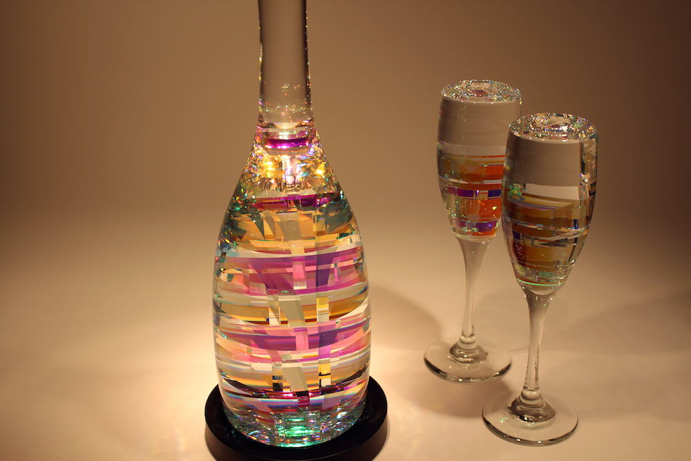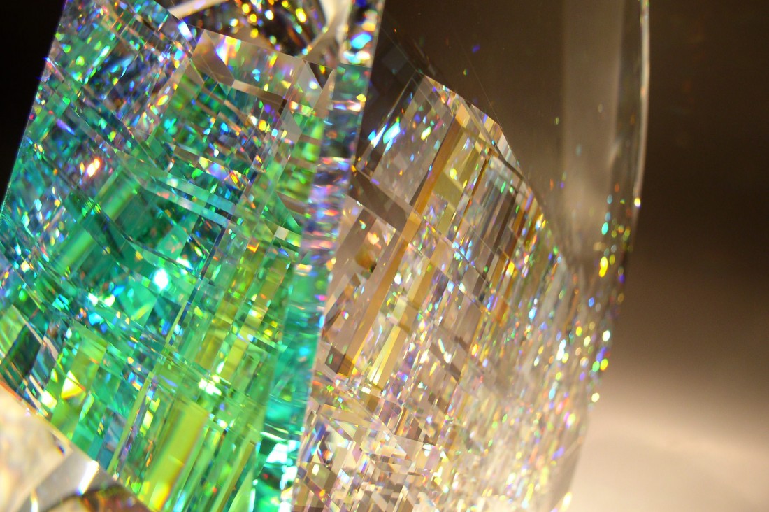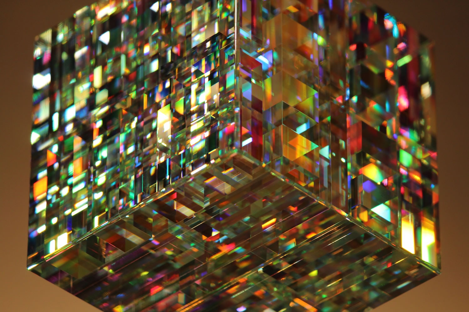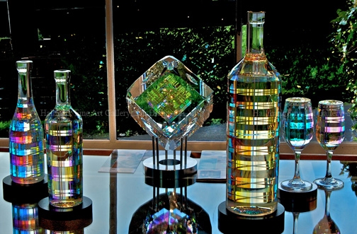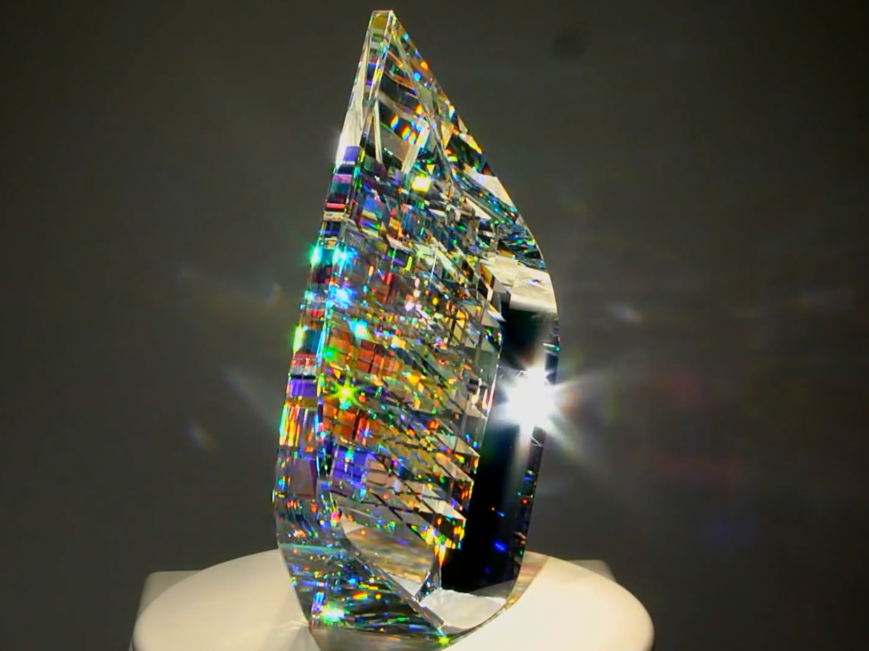 Like the glass sculptures by Jiyong Lee I wrote about last week in “Through the Looking Glass,” Storms uses cold glass-working methods to create his work, but the results are dramatically different. Where Lee’s pieces were smooth and almost gelatinous-looking, Storms’ work seems almost too perfect, too intensely reflective to be produced by human hands. They look like Borg art. Storms merges lead crystal and dichroic glass using a cold-glass process which involves sculpting and grinding and laminating and herculean strength and Job-like patience. One piece can take up to 24 weeks from start to finish. These are true labors of love, and I am utterly captivated by them.
