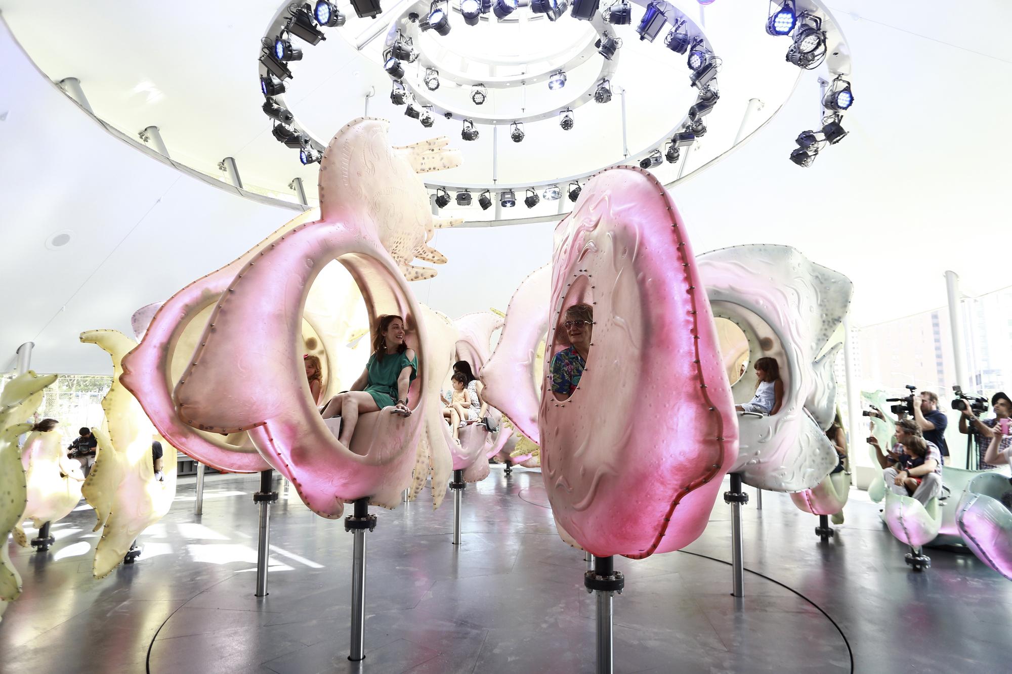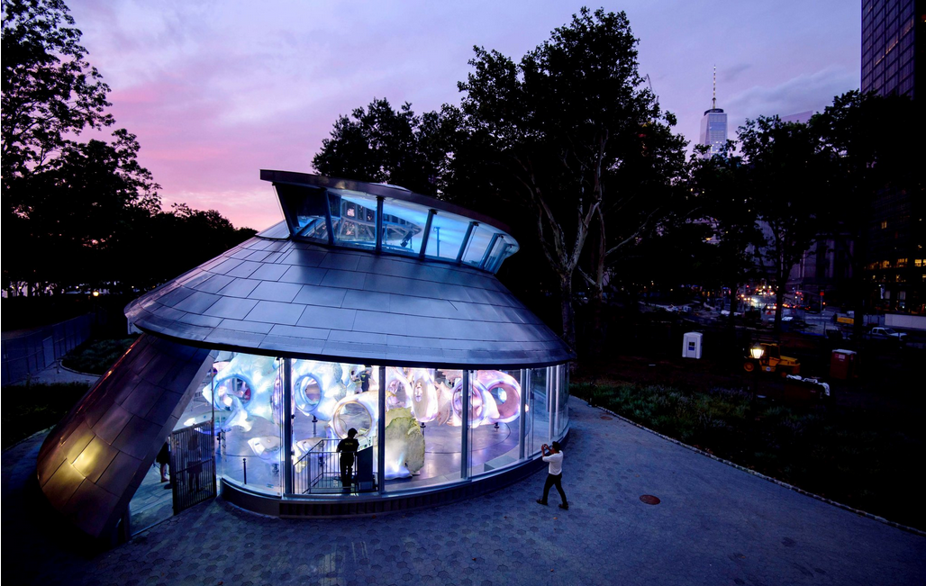 The Battery Park Conservancy has been working for 10 years along with stage designer George Tsypin and WXY Architecture to bring a very special carousel to Battery Park (newly dubbed “The Battery”) in New York City’s Financial District. The SeaGlass Carousel opened on Thursday, August 20, to wild acclaim. Looking at the pictures, the $16 million price tag seems like money well spent. I work only 3 blocks from the spot, so I see lots of lunchtime visits in my future.
