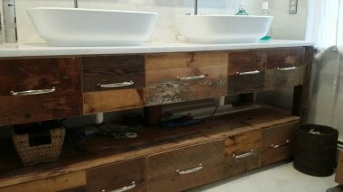 Reclaimed barnwood vanity with dual vessel sinks. Gorgeous! By NEFStudio