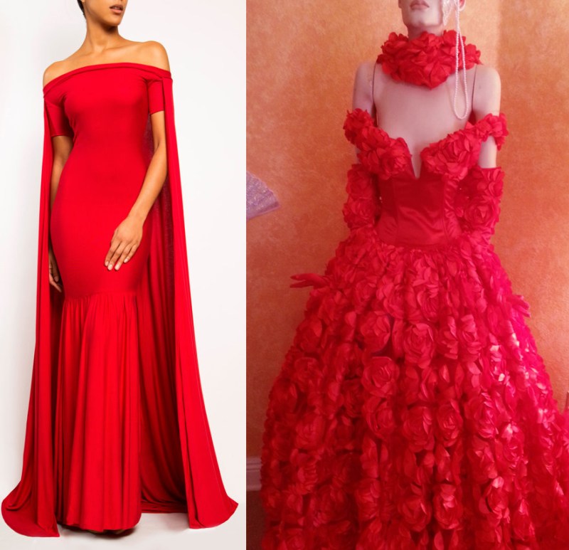 The glorious, red-carpet-worthy off-shoulder gown on the left can be had from FROCKLosAngeles for a mere $285. The crime scene on the left, on the other hand, costs $3,400 and will shoot you to the top of the worst-dressed list.