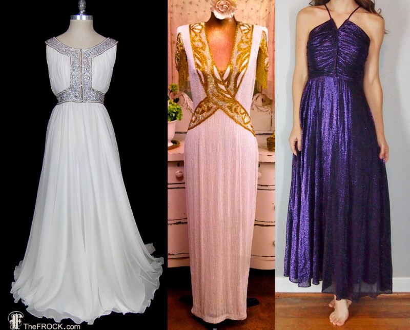 This vintage Bergdorf Goodman on the left sold by TheFrockDotCom may set you back a couple of thousand dollars, but it’s worth it! I love the dress in the center sold by SownThreadsClothing even if it is clearly goofy eighties fashion. And while the one on the right is neither great nor completely tragic, metallic Cadbury purple isn’t going to get you the kind of press attention you want.