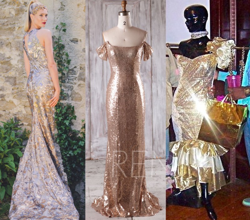 This gold-and-silver sequin gown on the left by AmyMairCouture would certainly look at home at an awards show. While the dress in the center by RenzRags may be a teensy bit bridesmaidy, I think thanks to the clever little cap sleeves and boned top, you might get away with it. But you should be careful crossing the street in the dress on the right. You’re likely to blind oncoming drivers. Come to think of it, they might be grateful for that.