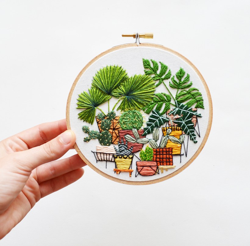 The embroidery definitely would brighten a space as much as a real house plant, and yes, not be subjected to unintentional but nevertheless harmful plant parenting!