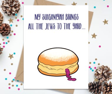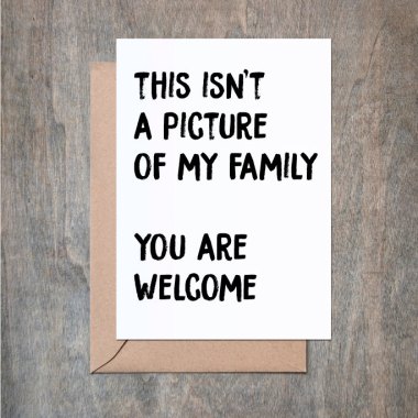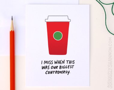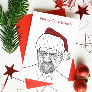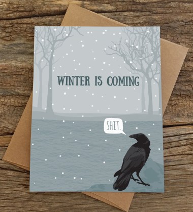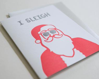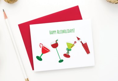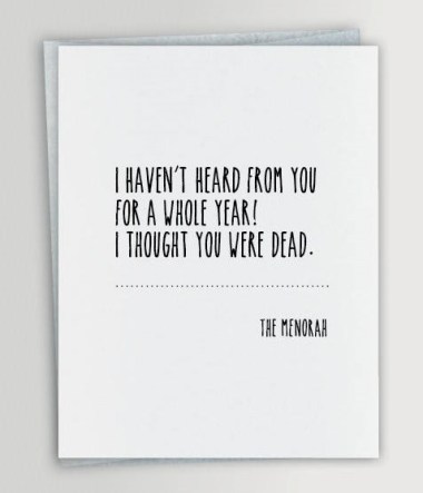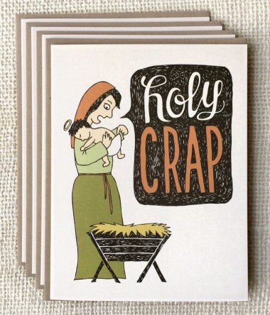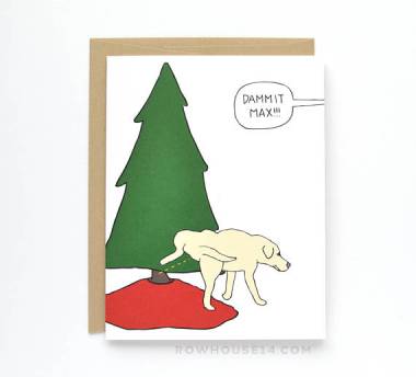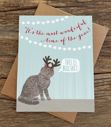 The holidays are the only time of year when I look forward to opening the mail. My people are creative and funny and have great taste, so the majority of the holiday cards we receive make me ooh and aah and hahaha. And I enjoy sending them as much as I do receiving them. I usually take at least a few weeks to plan and search for just the right thing. And sometimes, I even get ambitious and make my own. I write the cards, and Beloved addresses the envelopes. We have a list of about 100 households that get the first wave, then we end up sending out about 20 or so retaliatory cards (A card from my first grade teacher? How did she even get my address?). However, Beloved and I discussed it, and we’re giving it a miss this year. We’re still not home, and I left my holiday card list in the house thinking we’d be home (“5 months” they said. “You’ll be home by August,” they said.). It’s just too much to manage between the teensy apartment and our ridiculous schedule. This decision filled me with equal parts relief and guilt. So in lieu of sending cards, I thought I’d instead show you some of the hysterical offerings available on Etsy!