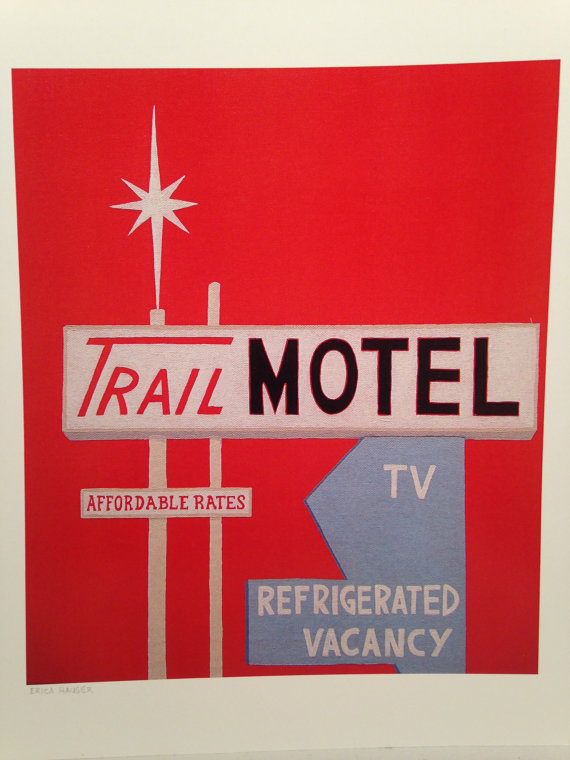 Well in Britain we famously had wonderful rail travel posters and ferry posters dating from the 1930s through to my childhood in the 1970s that had that same sort of graphic sense of line and bold colour choice, though the style obviously evolved a bit over time. We definitely have some equivalents, just not things like diners and motel signs.