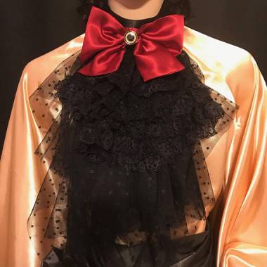 The description suggests this ruffled jabot would be a fun replacement for a bow tie on a young man. I love the idea, but I hope it comes with a bodyguard.