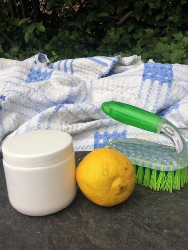 “Everything you need to clean your bathroom” kit includes a jar of baking soda, a rag, a scrubbing brush, and a lemon. That’s right. A lemon.