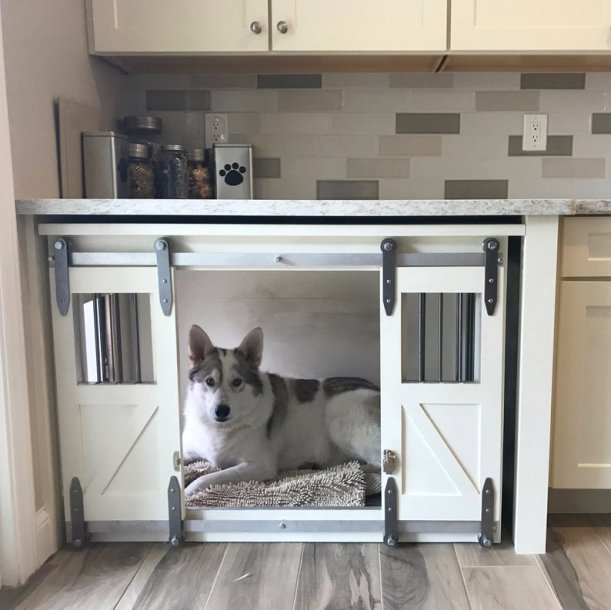 I love the idea of this dog crate built into your kitchen cabinets! (I also love that the floor and crate match the dog!) By TheRusticForest