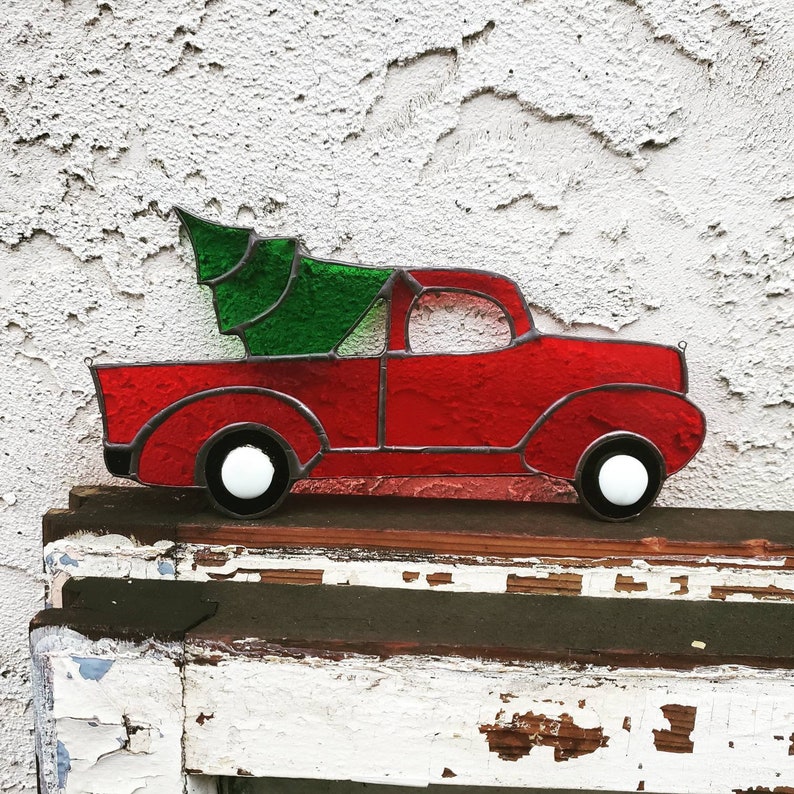 I have never owned a truck in my life, but I come the holidays, I’m a sucker for anything bearing a red pickup truck! By AAStainedGlassShop
