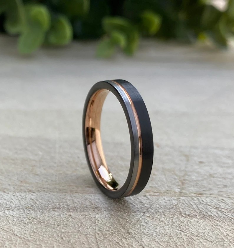 I adore the minimal touch of rose gold in this tungsten wedding band! By RCorneJoJewelry