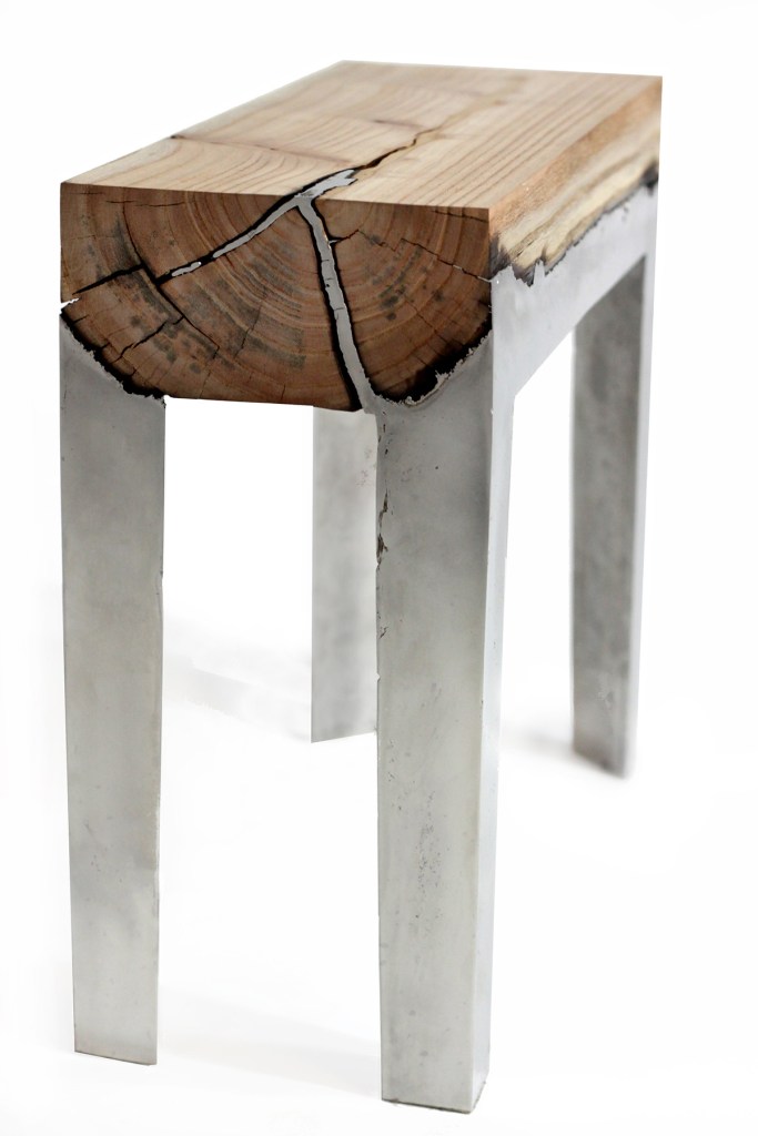 8/12/14: Young Israel-based industrial product designer Hilla Shamia has found a way to merge poured aluminum with irregularly shaped wood pieces to make very desirable benches and small tables. During the process, molten metal is poured into the natural tree trunk, burning it slightly as they adhere to one another. The result is a beautiful ombré effect that brings out the best in both materials. The trunks are then cut, and legs are added to the pieces. The process is genius. I never would have thought of merging the wood and metal before cutting the wood.