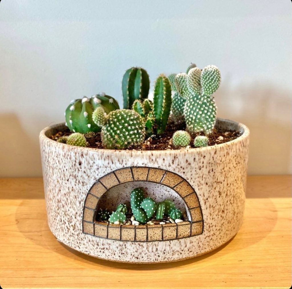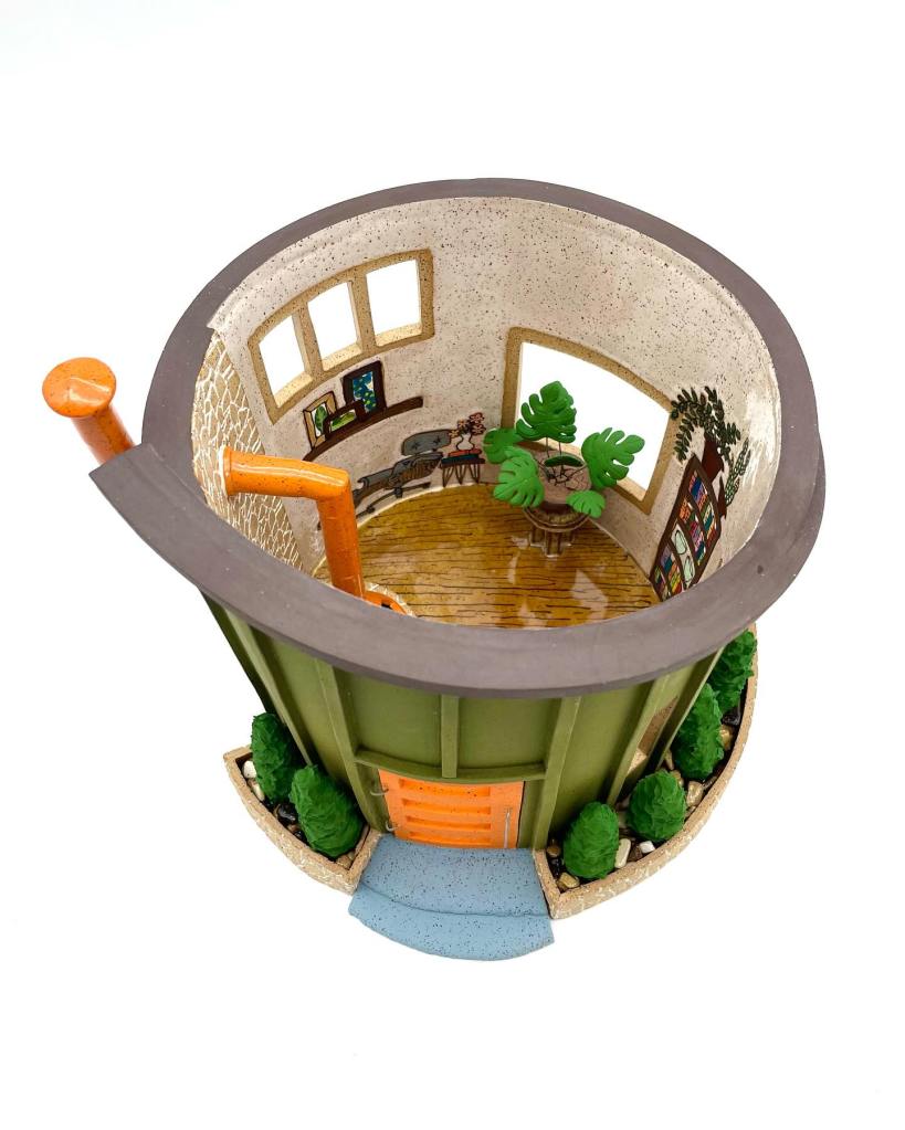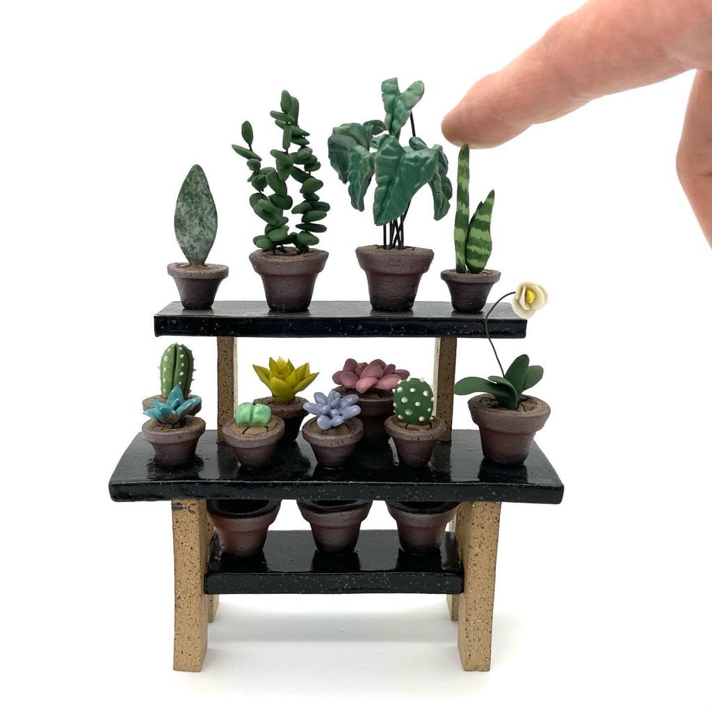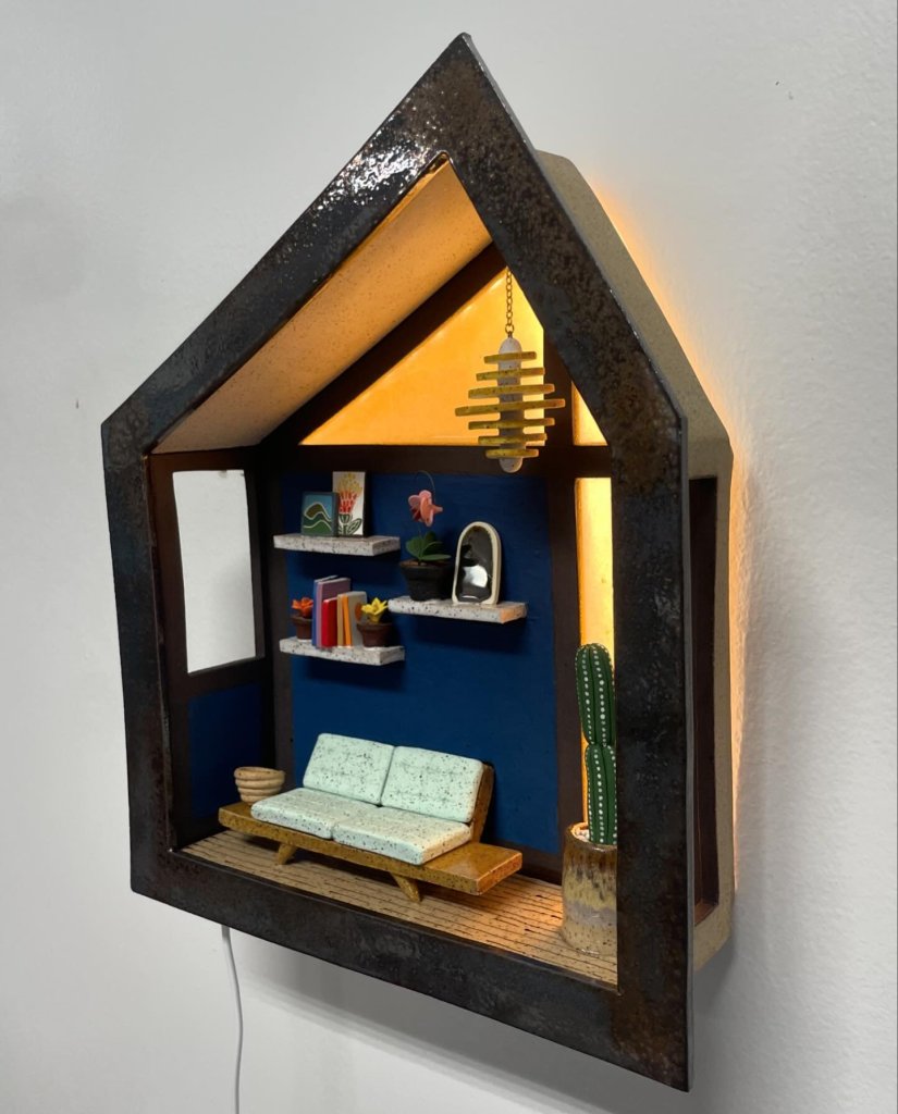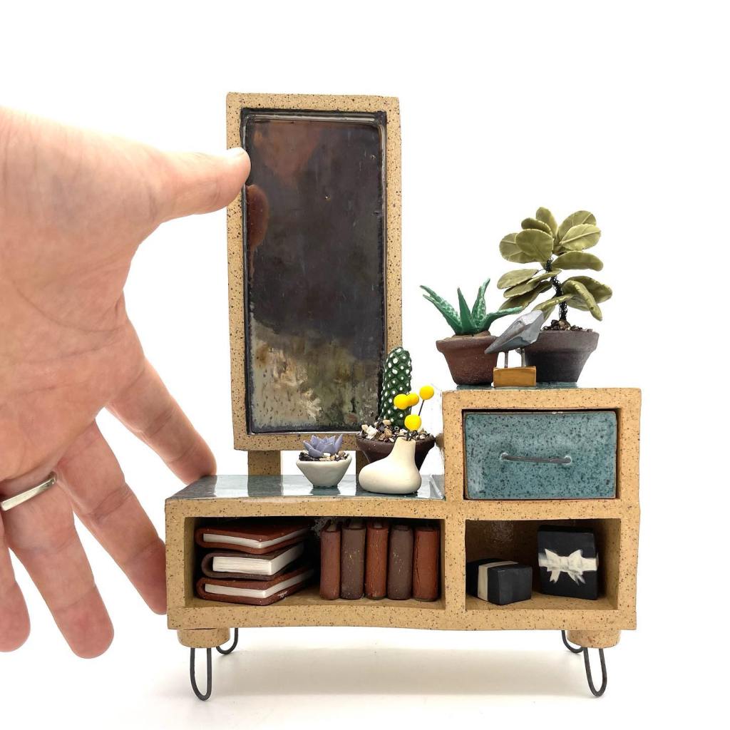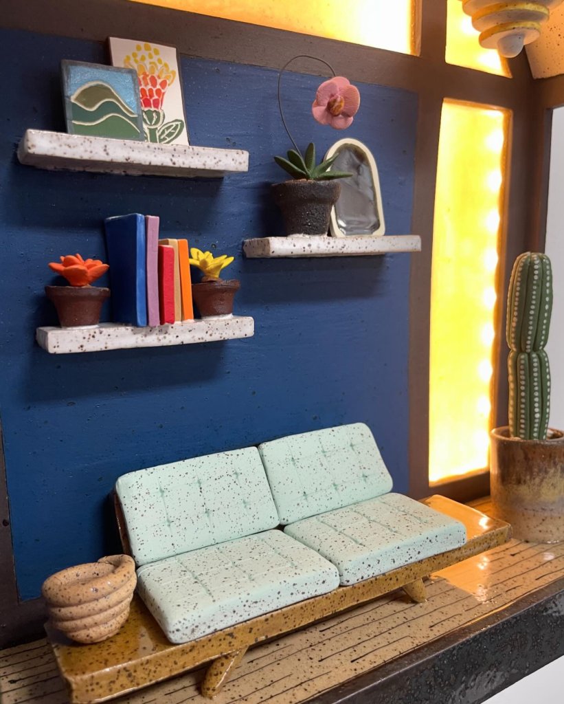 Many of the little objects in Schroeder’s works refer to someone in her life, the books for her avid-reader husband, the succulents for her botanist grandmother, the flowers for her florist mother. Her mid-century modern sensibilities reflect that of her family home and the good days she remembers there. I guess that’s why her work gives me such a feeling of welcome. (Plus, they’re positively adorable!)