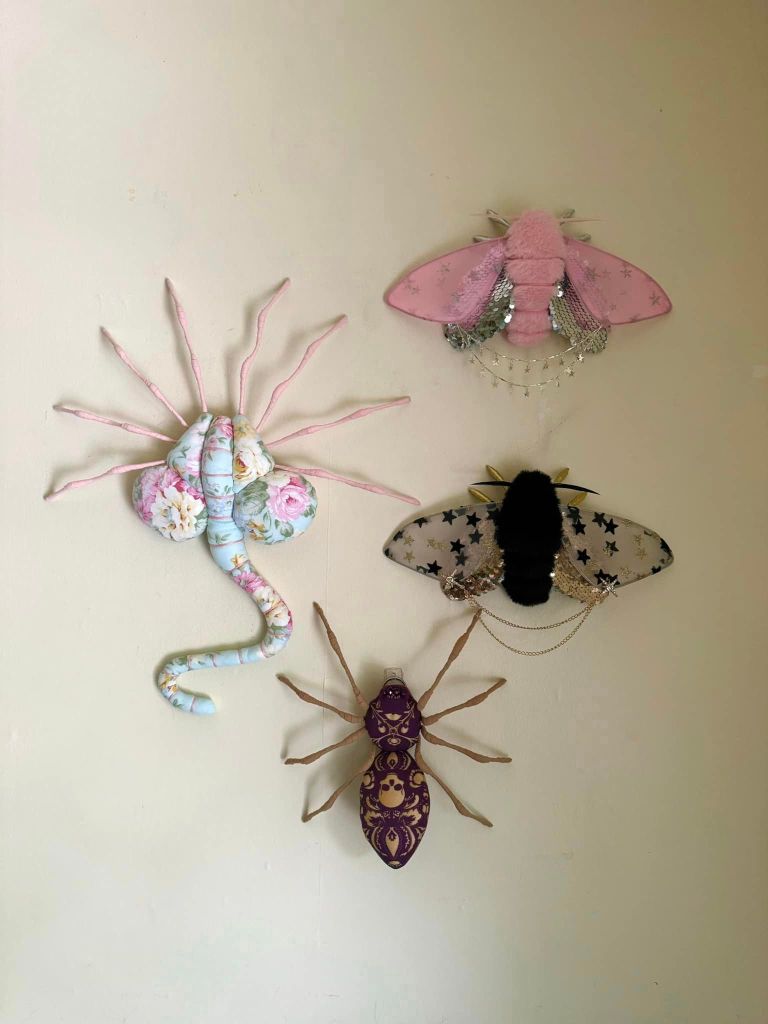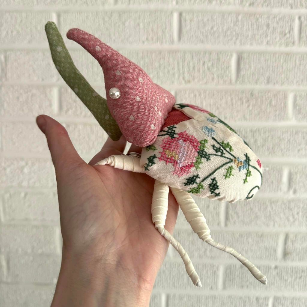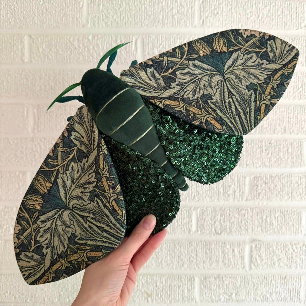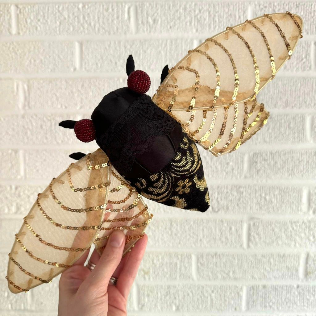 “Shortly after starting out on my own, I decided I would make a cicada art piece for my bug loving friend, Sarah May. Having been a seamstress for a decade at that point fiber was the medium I was most familiar with, so I figured why not give soft sculpture a try. My first attempt did not go well. In fact I went through a few patterns and prototypes before I finally created one that I was happy with. I loved the process so much I decided to keep it going with different insect species.”