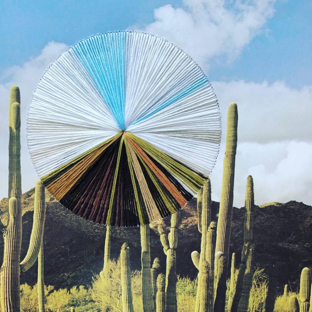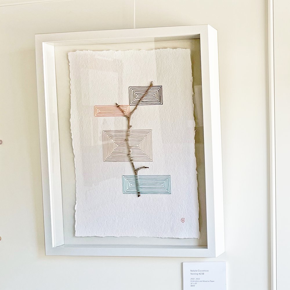 Dutch-born/California-based mixed media artist Natalie Ciccoricco creates wonderful collages with found objects, images, and embroidery thread. I am fascinated by the way she takes a relatively predictable landscape and using thread, she creates what looks like a disturbance in the space/time continuum. Her project known as Nesting features and other objects like twigs and wooden kitchen spoons embroidered onto textured paper to create intriguing shapes and lines. I love the balance and sense of serenity they convey.