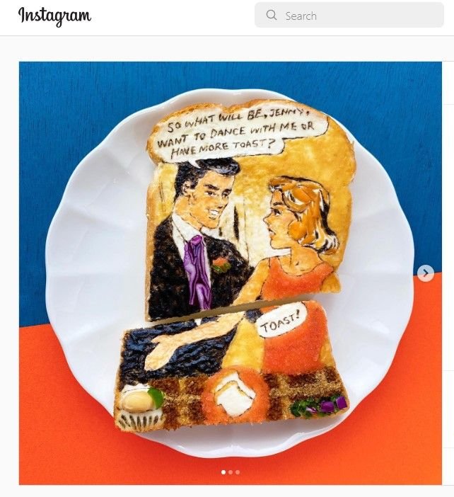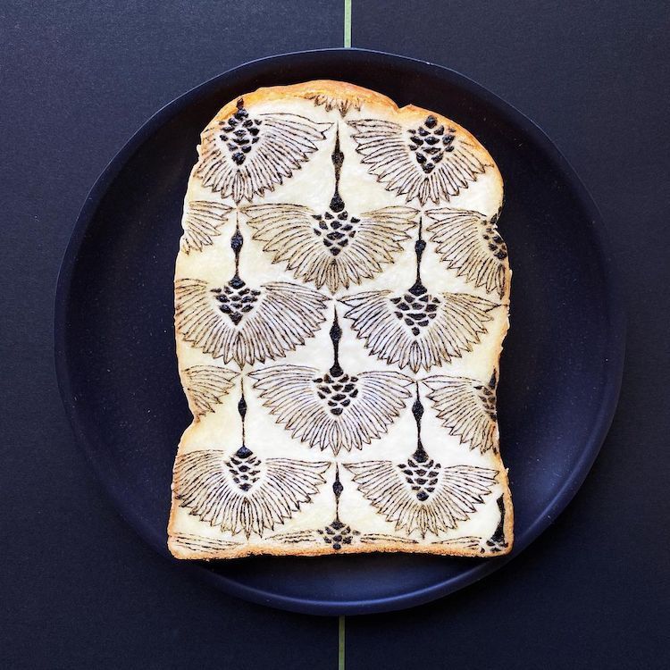 Once more I marvel at the creativity of the human mind. Using toast as a substrate is not something most people, myself included, would ever have come up with but this artist has achieved results that make it seem as if it should have been obvious. I am impressed with the artistry but also the fact that the art work is so sharp and crisp. I would have imagined the pigments would bleed all over the place on something as absorbent as toast. All round impressive.
