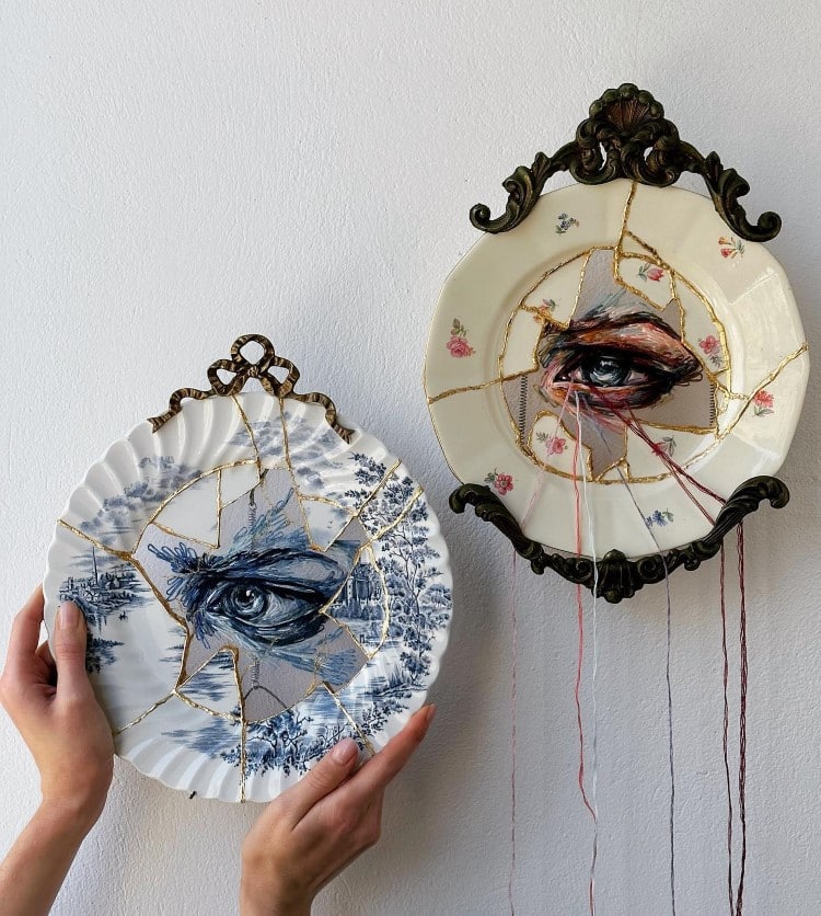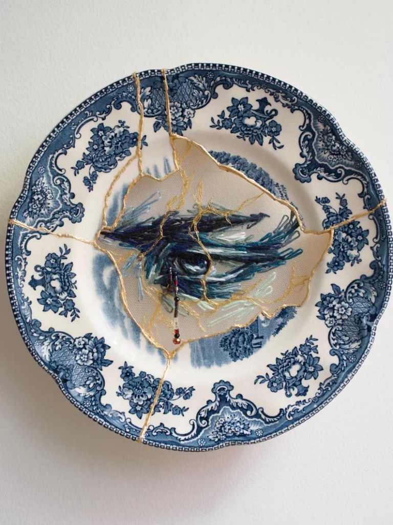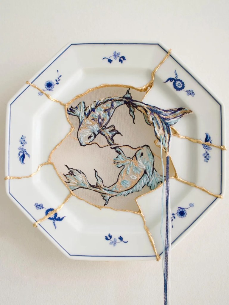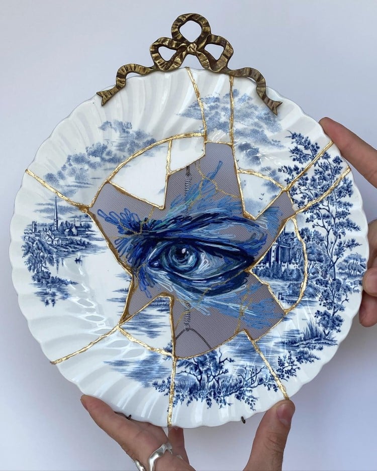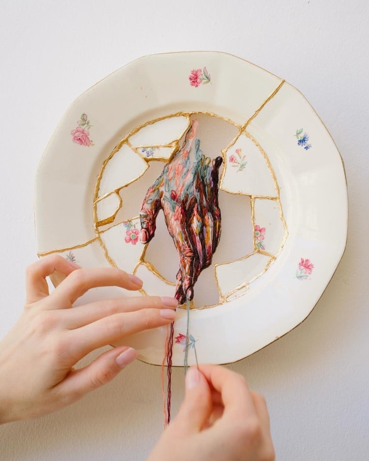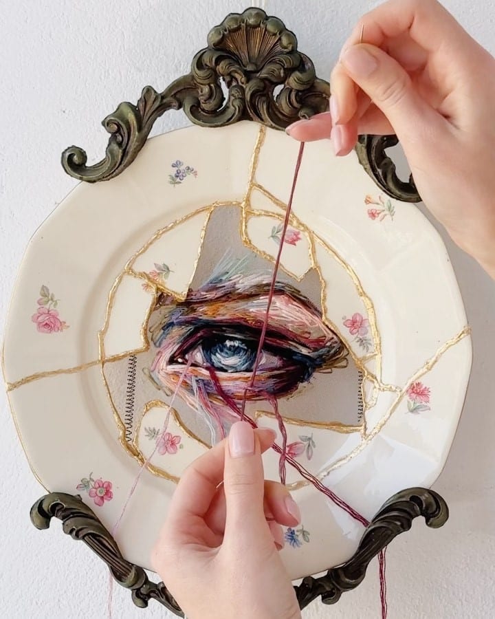 Marchenko also had a very successful collaboration with mixed-media artist Artashes Sardarian. The mashup starts with a blend of broken vintage plates, partially joined together using kintsugi, then further connected with Marchenko’s embroidery. The results are very interesting and good intentioned, too!