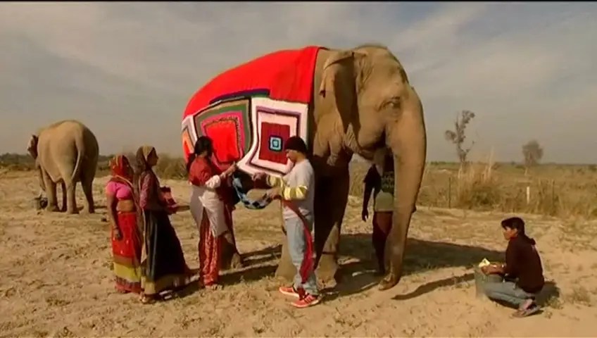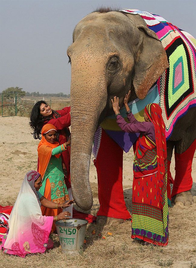 I live for things like this… In the town of Mathura in northern India, villagers are knitting giant sweaters to keep rescued elephants warm during winter.The sweaters even cover the animals’ legs, so the whole project is reminding me a bit of Etsomnia™… The beasties all live at the Wildlife SOS Elephant Conservation & Care Center, which takes in rescued elephants saved from rough working conditions where they suffered neglect and daily beatings. They’re happy and healthy now, and with their colorful jumpers, they’re really brightening up the joint!