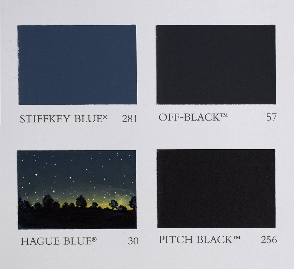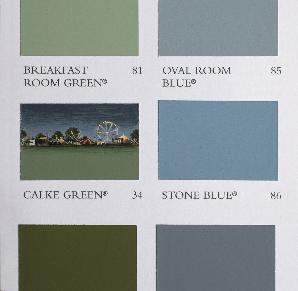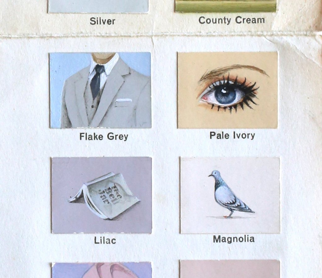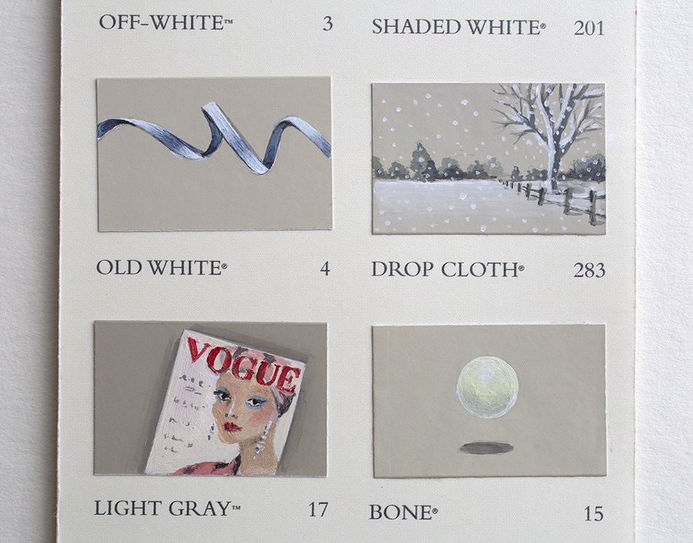 Spelling’s subjects are often inspired by both the color of the paint and the name, and they vary wildly. She works on a combination of new swatch booklets and, when she can find them, vintage paint swatch books.
