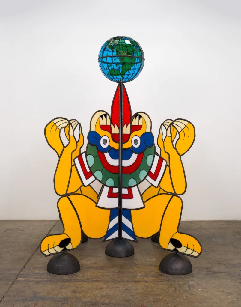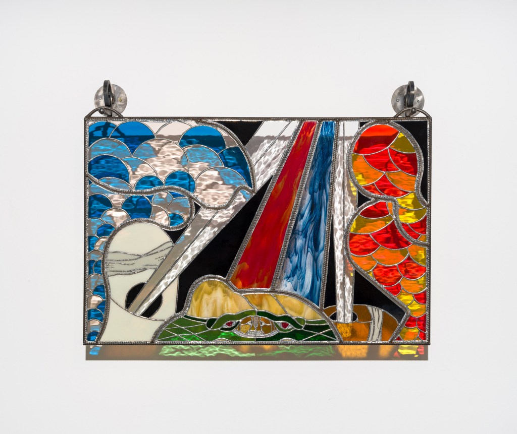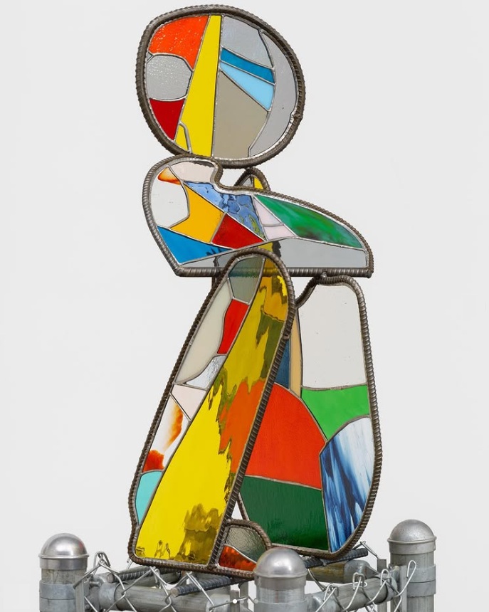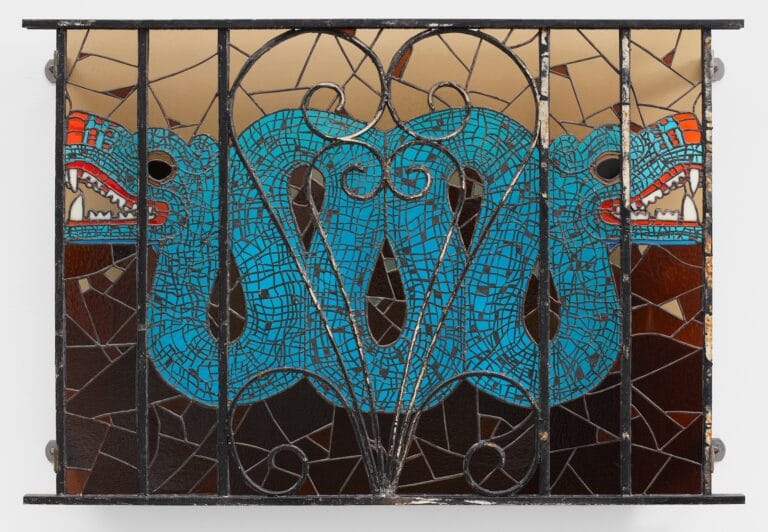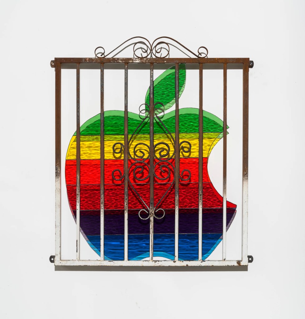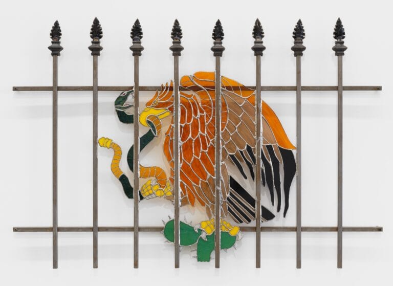 Oklahoma-born stained glass artist Timo Fahler uses his Mexican heritage and found objects, mixed with traditional stained glass methods to create something very new. His Mesoamerican references give great power to his pieces, and he infuses them with contemporary critical thinking concepts. His colorful subjects are often shown caged in some way, whether behind a wrought iron gate or reclaimed rebar or chain link or some other kind of prison-like interference.