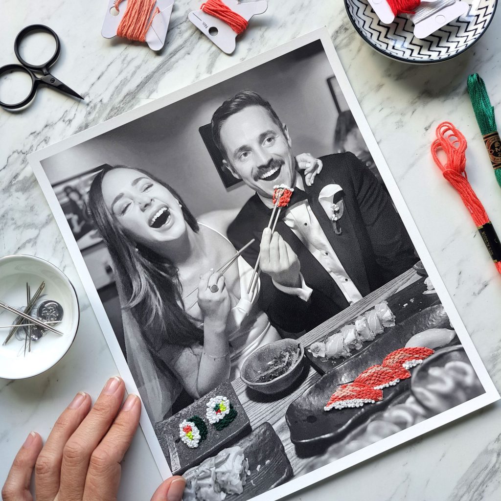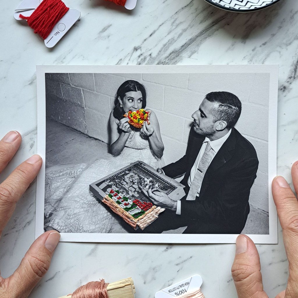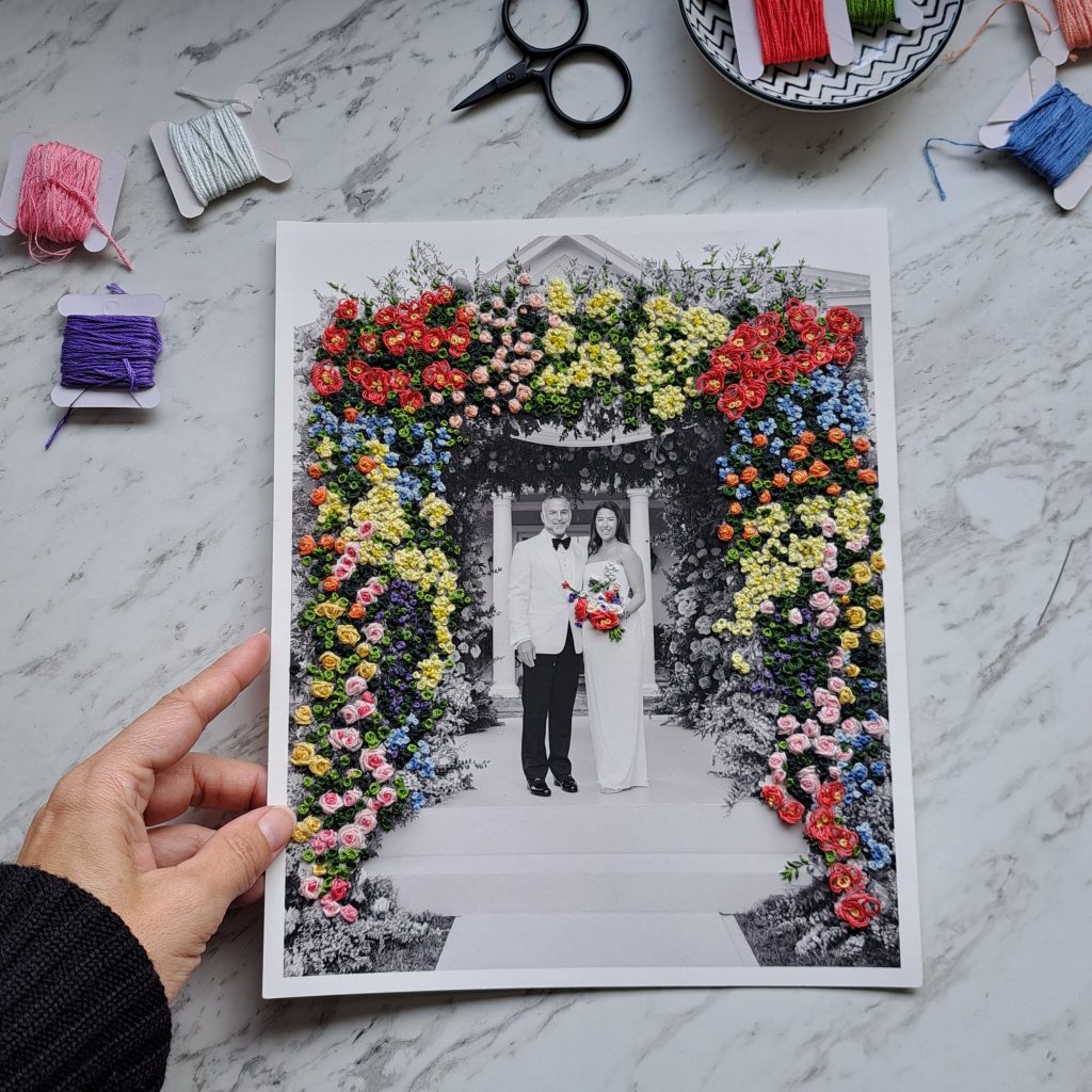 Today, we’re looking at the lovely, joy-filled embroidered photos by a maker who goes by the name BORDÉ by Katia Herrera. Herrera takes your special photos, old and new, and adds beautiful, delicate embroidered elements to make a truly special, one-of-a-kind keepsake. The self-taught fiber artist has always had an interest in preserving images that are important to people. And by embroidering certain aspects of the photos – the lace of a veil, a floral arch, a slice of pizza – she gives those static images new life.