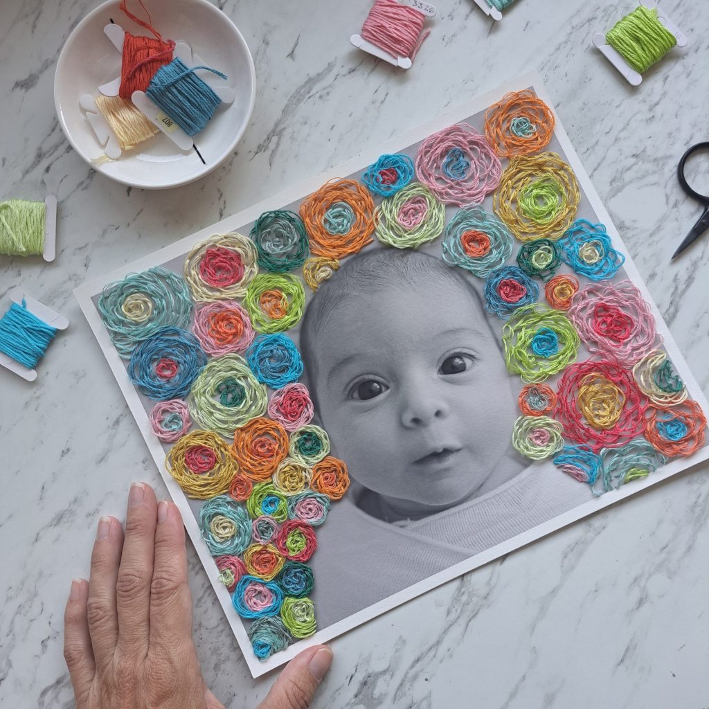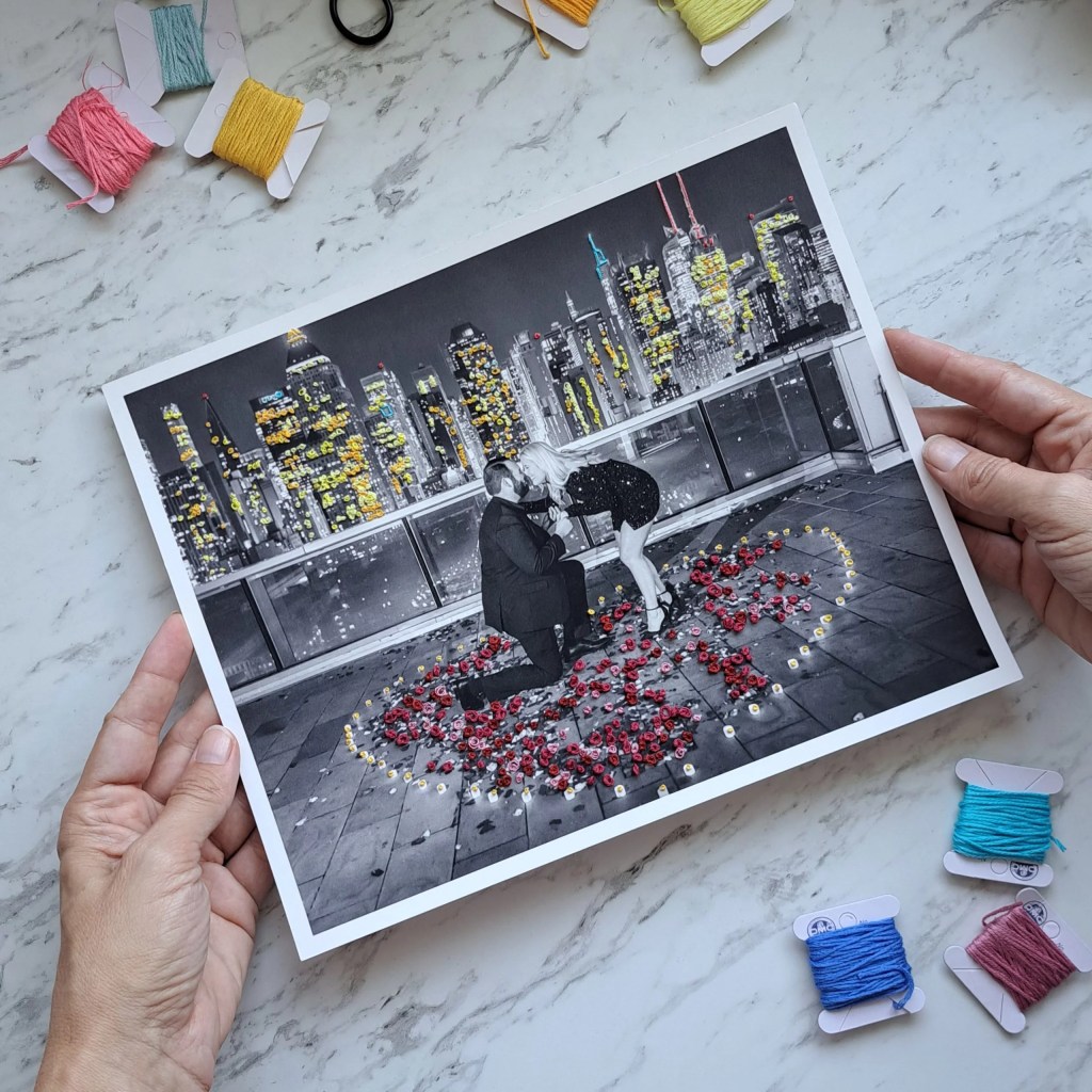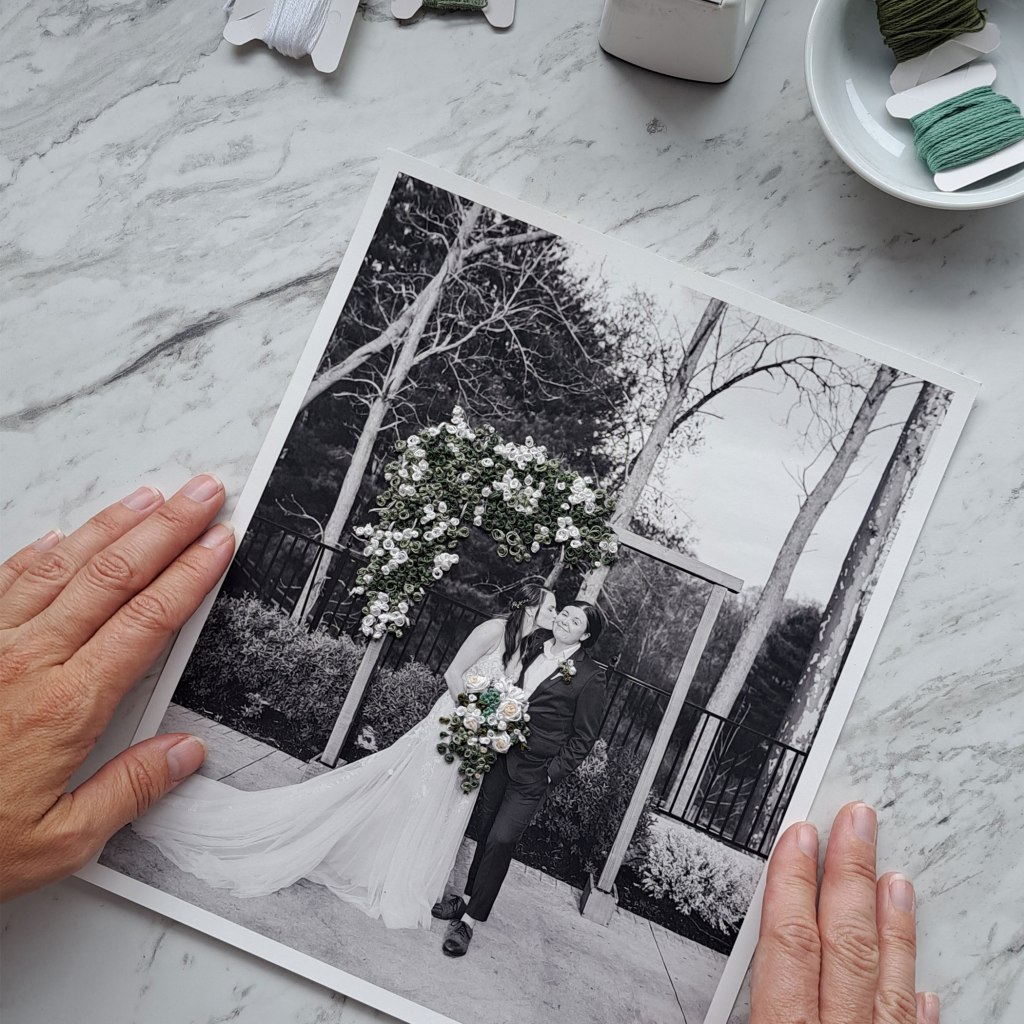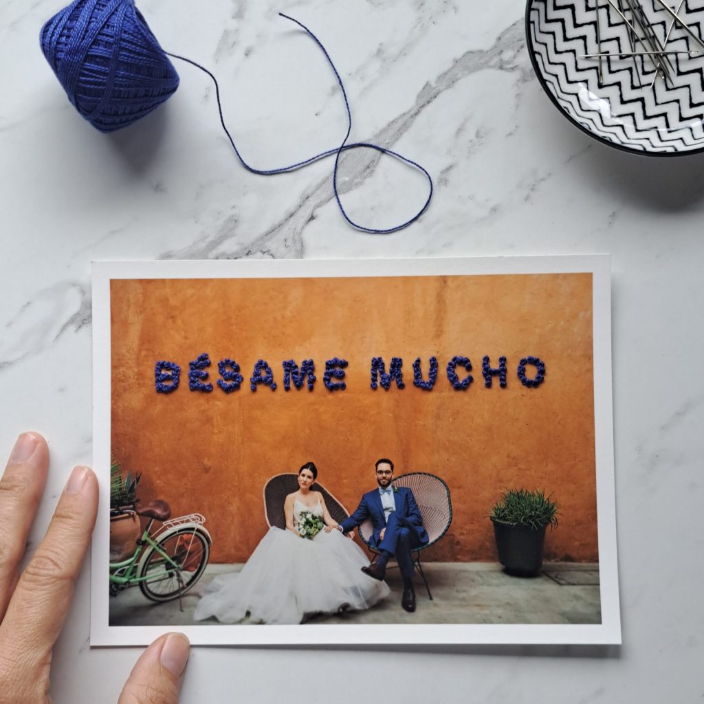 Today, we’re looking at the lovely, joy-filled embroidered photos by a maker who goes by the name BORDÉ by Katia Herrera. Herrera takes your special photos, old and new, and adds beautiful, delicate embroidered elements to make a truly special, one-of-a-kind keepsake. The self-taught fiber artist has always had an interest in preserving images that are important to people. And by embroidering certain aspects of the photos – the lace of a veil, a floral arch, a slice of pizza – she gives those static images new life.