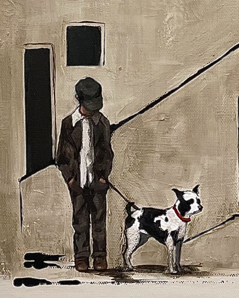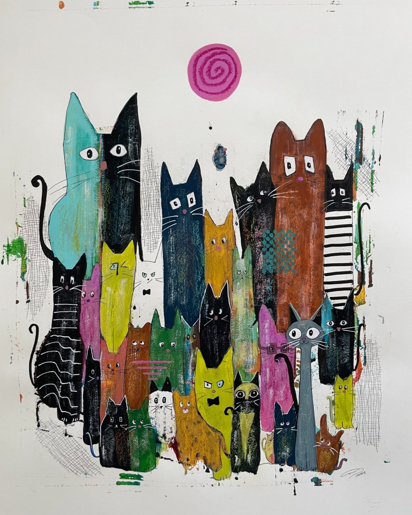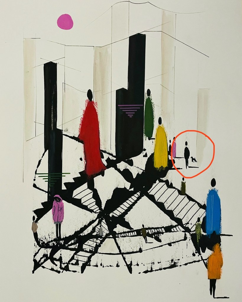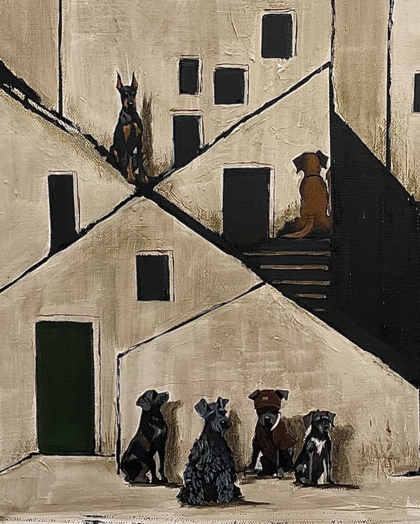 Her work is a compelling mixture of pets and people and architecture, and I find it dynamic and interesting. Carpena’s abstract shapes begin with an interesting process by which she dips glass balls in paint and knocks them around her canvas. She then lets the marks the balls make inform the painting’s subject. I don’t know how much control she exercises over the trajectory of the balls, but the chaos the process creates means her work is always reinventing itself.