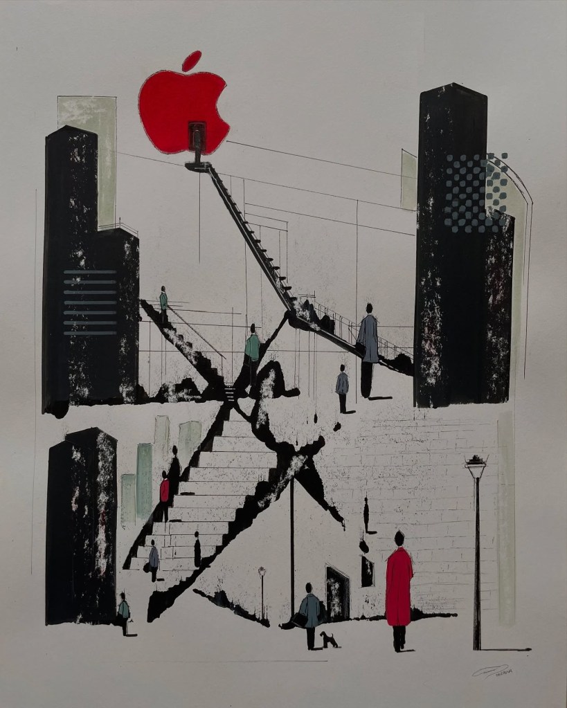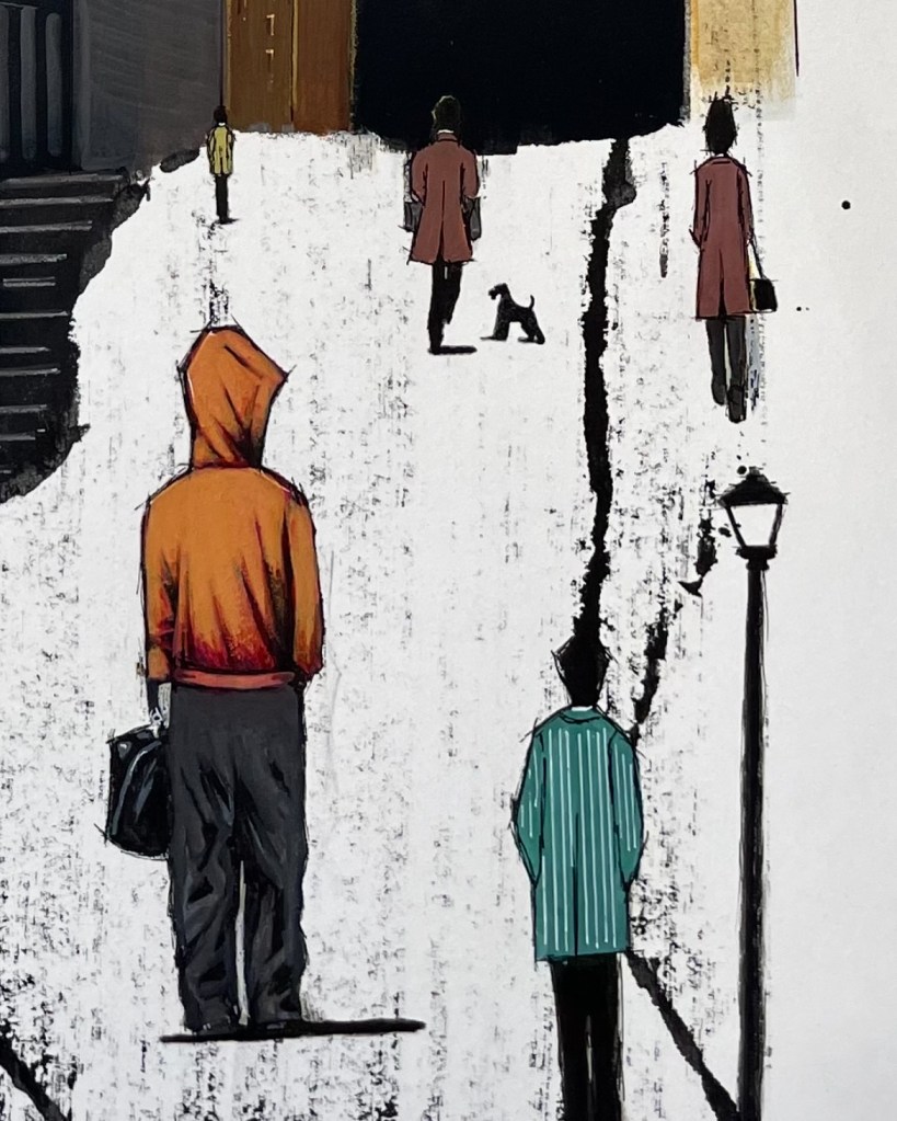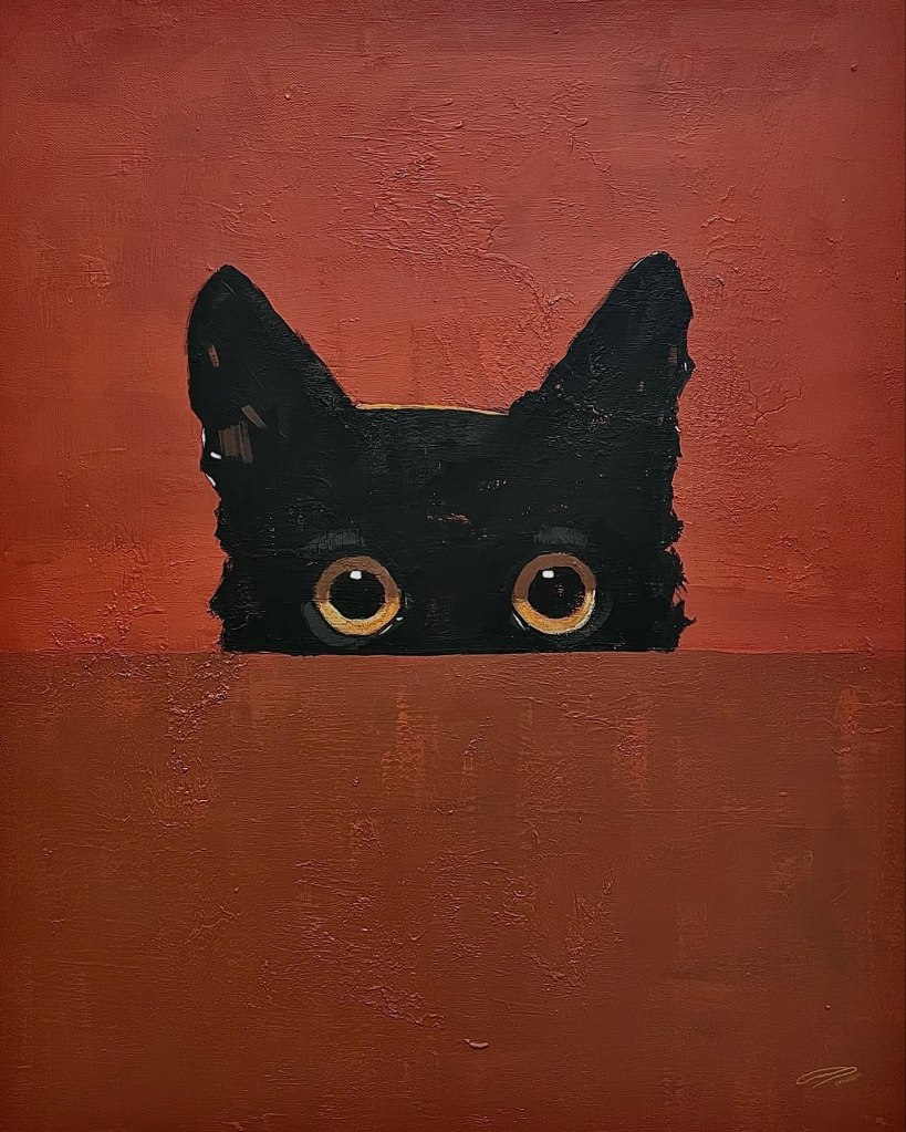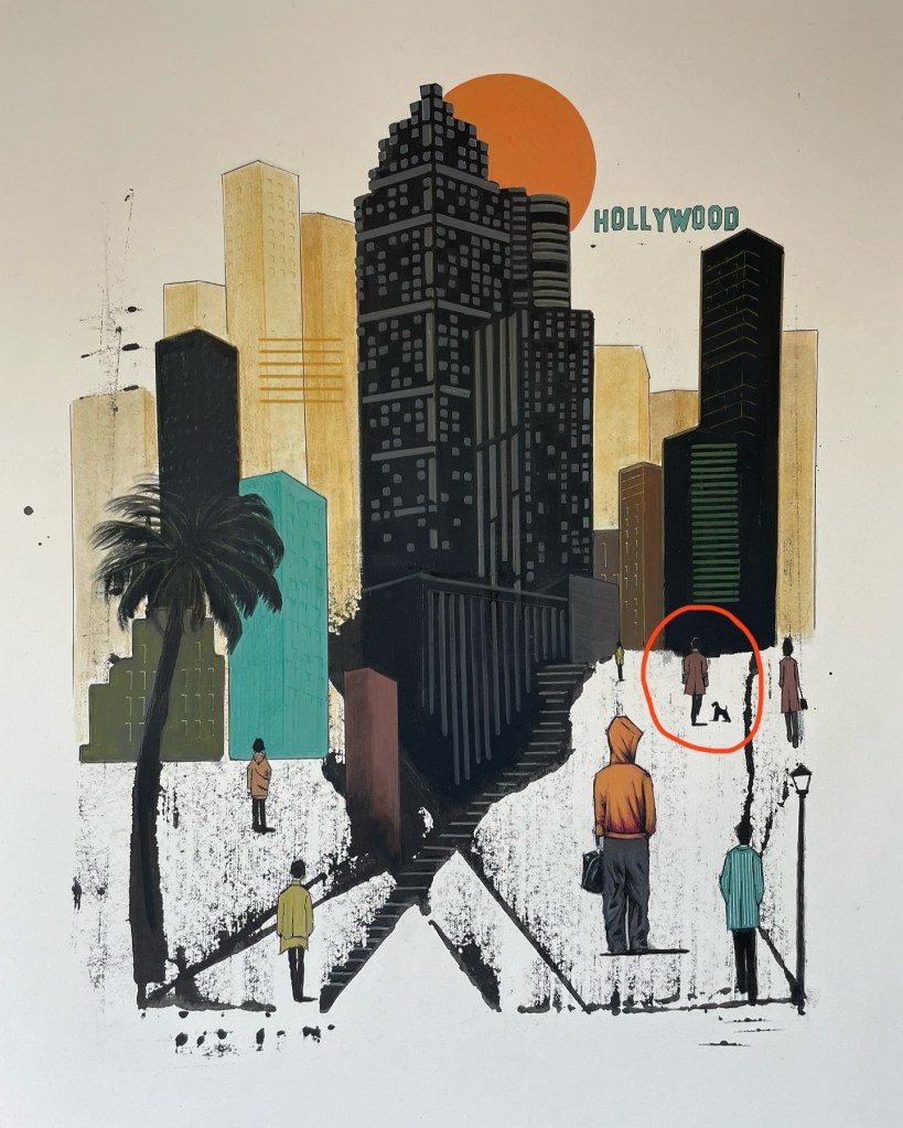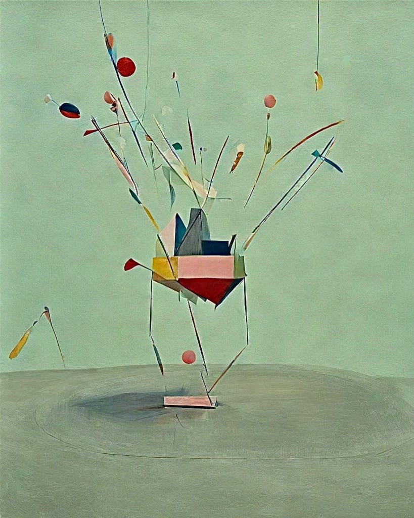 Her work is a compelling mixture of pets and people and architecture, and I find it dynamic and interesting. Carpena’s abstract shapes begin with an interesting process by which she dips glass balls in paint and knocks them around her canvas. She then lets the marks the balls make inform the painting’s subject. I don’t know how much control she exercises over the trajectory of the balls, but the chaos the process creates means her work is always reinventing itself.