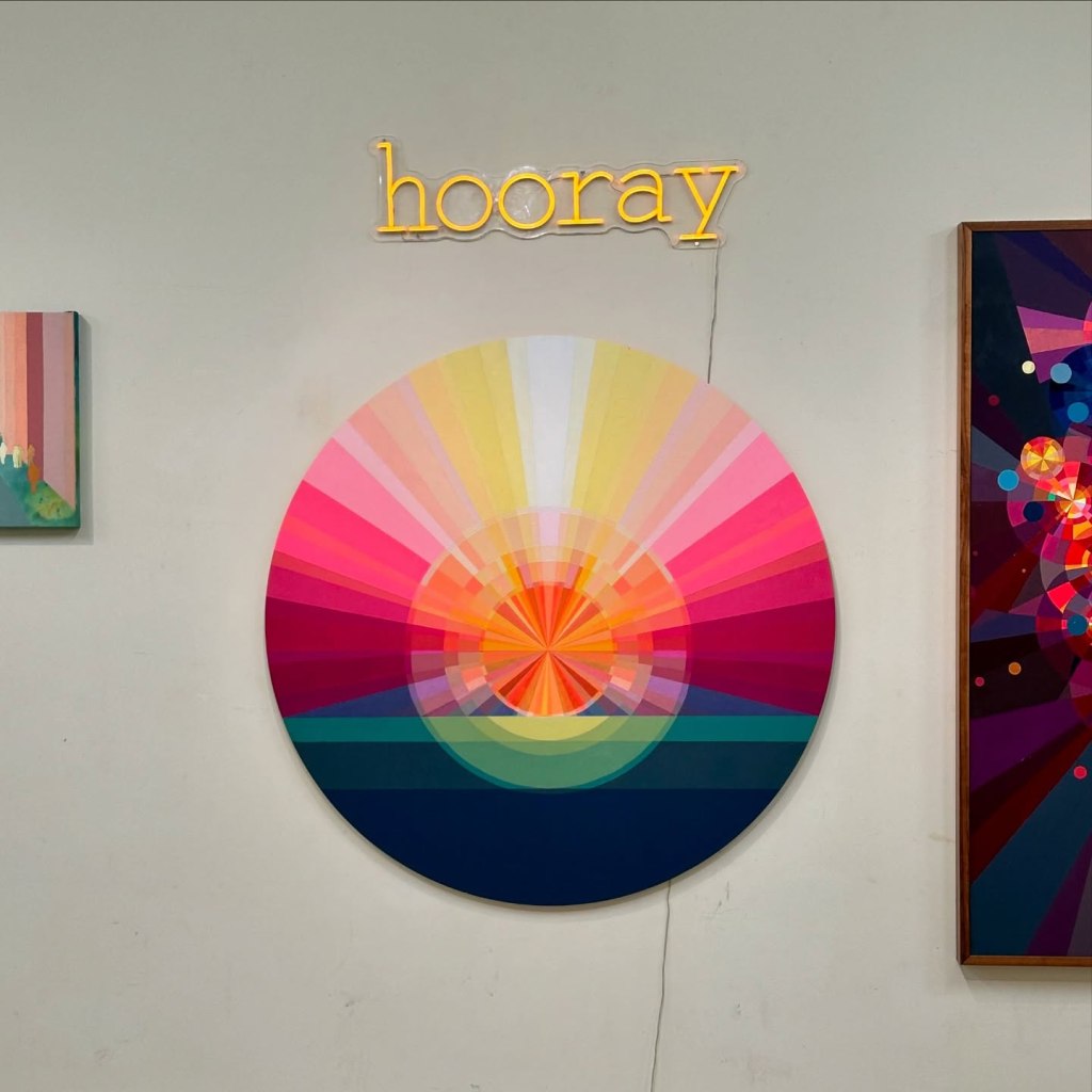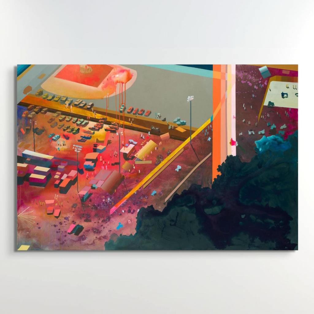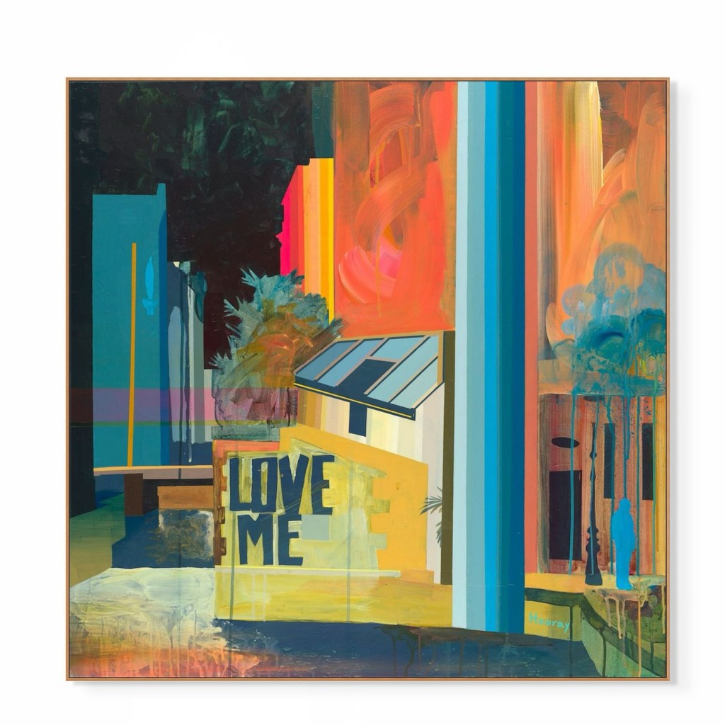 The awesomely-named American artist Kate Hooray Osmond (how adorable are her parents to name her that?) works harder than most – if not all – of the artists I’ve profiled previously. Apparently, she travels by helicopter, climbs construction cranes, and even repels from buildings to capture her source images. Somebody buy that girl a drone! Osmond says her work is an exploration of non-judgement and the “impossibility of experience.” Her large-scale canvases are joyously covered in bold colors and gold leaf, and they’re making me feel happier.