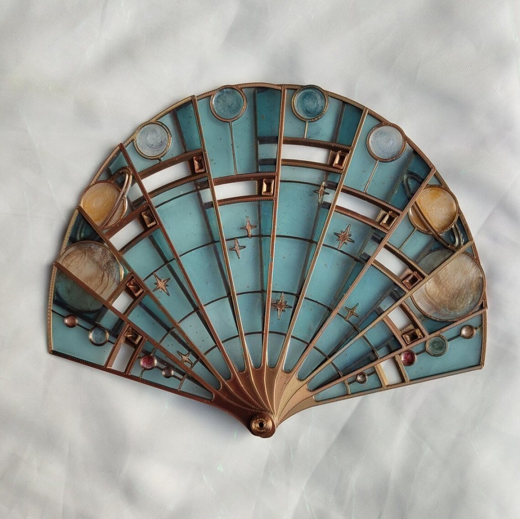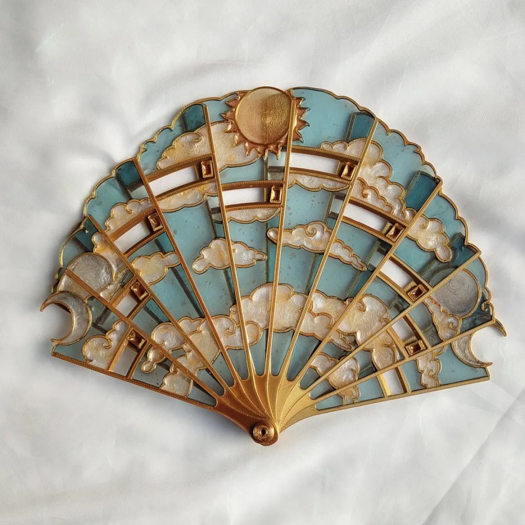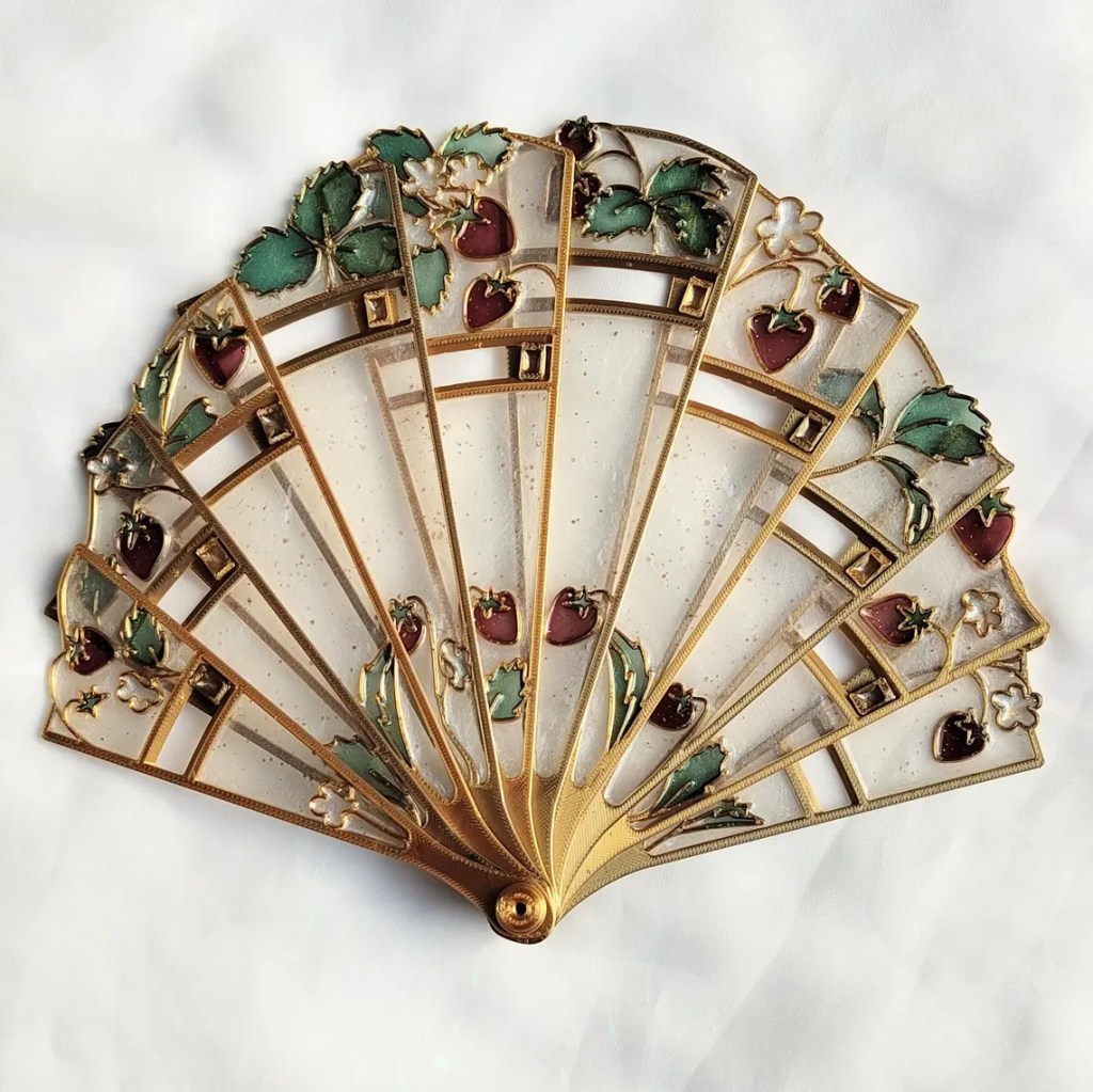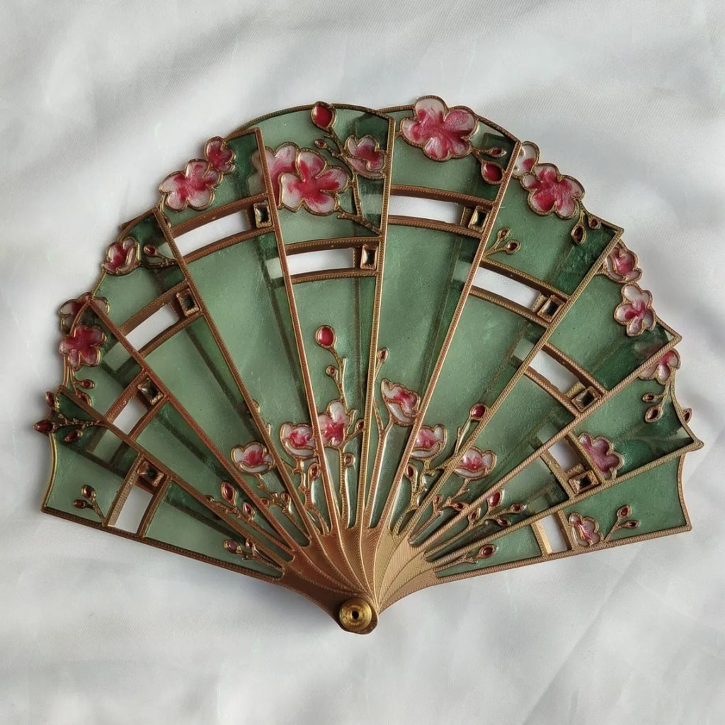 I am a huge believer in hand fans. My collection got me through peri-menopause and menopause with panache and a slight breeze. Plus, I can never resist a good fashion accessory. So when the glorious, handmade epoxy fans created by the maker who calls herself Mad Mad Raven popped into my feed, I was powerless against their charms. All that saved me is that the artist isn’t currently shipping to the U.S. Hailing from Ljubljana, Slovenia, the artist, Raven, designs the interlocking panels of each fan in a computer, then 3D prints the frame and meticulously fills each empty space with brilliantly-colored resins. The resulting hand fans are so glamorous-looking they could pass as antique plique-a-jour work!