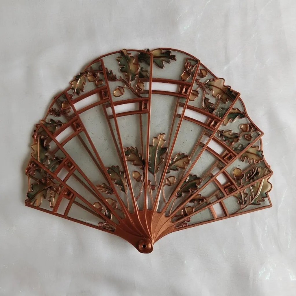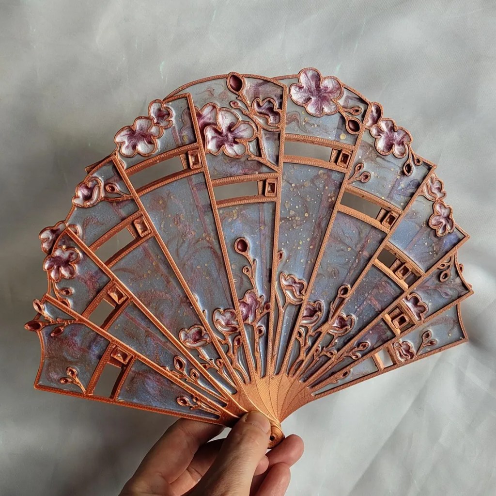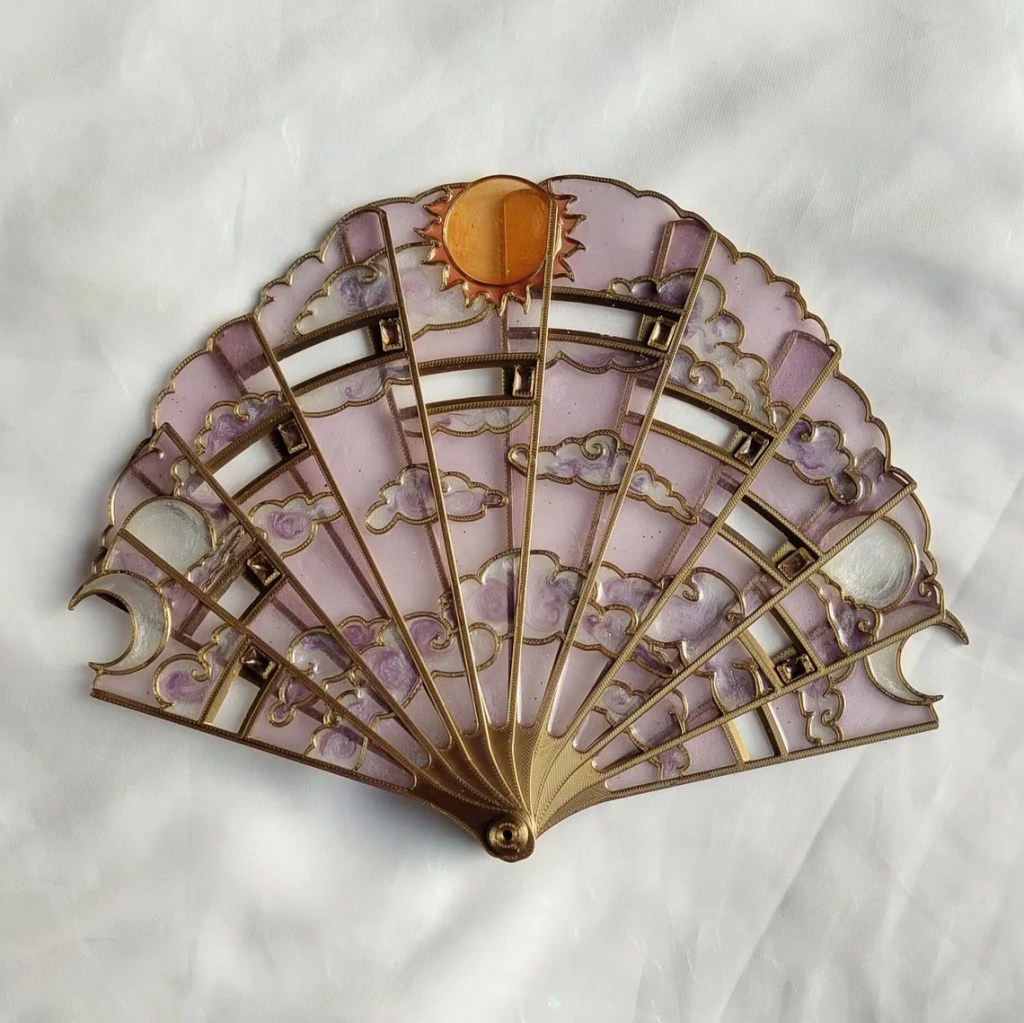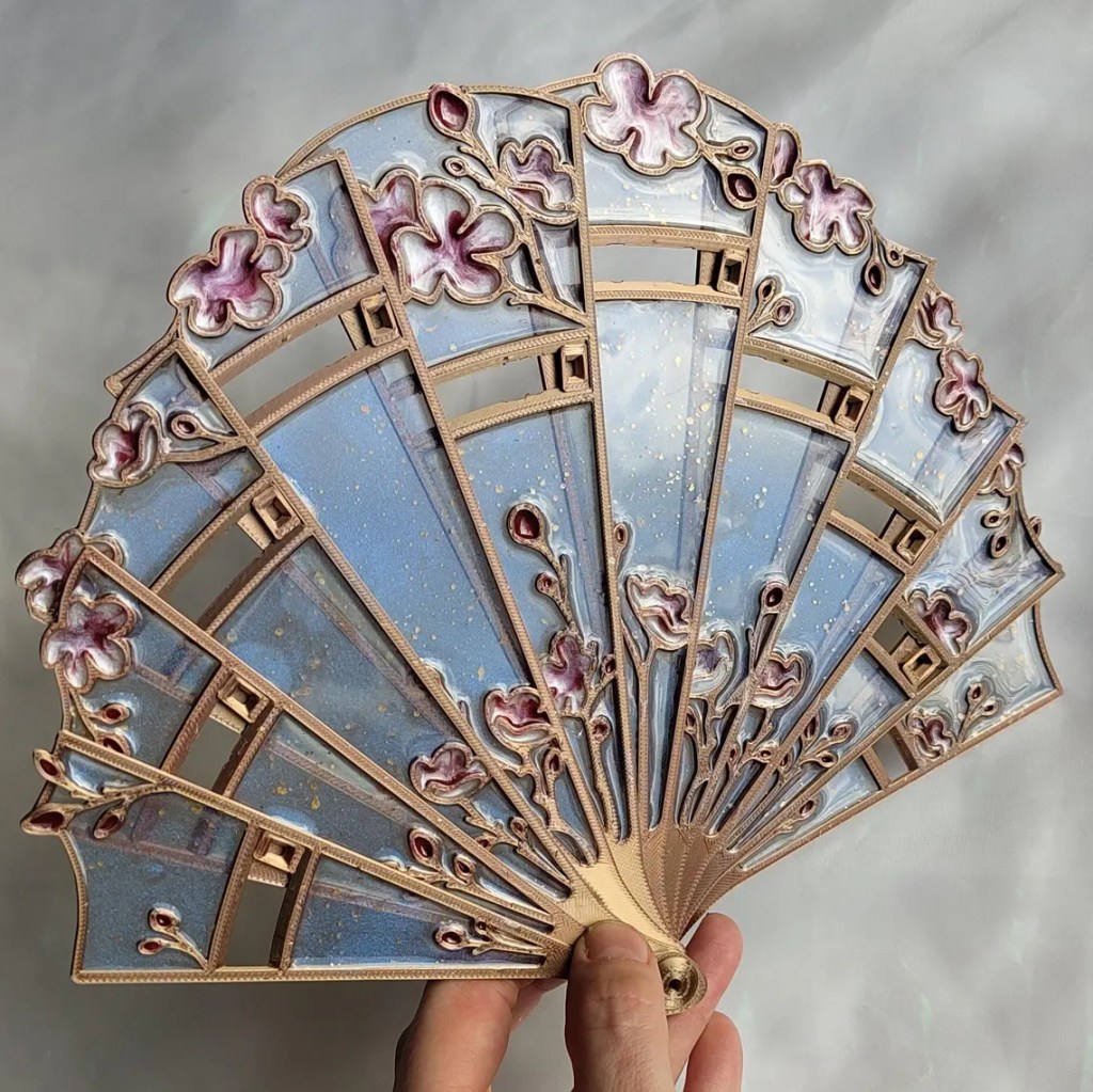 I am a huge believer in hand fans. My collection got me through peri-menopause and menopause with panache and a slight breeze. Plus, I can never resist a good fashion accessory. So when the glorious, handmade epoxy fans created by the maker who calls herself Mad Mad Raven popped into my feed, I was powerless against their charms. All that saved me is that the artist isn’t currently shipping to the U.S. Hailing from Ljubljana, Slovenia, the artist, Raven, designs the interlocking panels of each fan in a computer, then 3D prints the frame and meticulously fills each empty space with brilliantly-colored resins. The resulting hand fans are so glamorous-looking they could pass as antique plique-a-jour work!