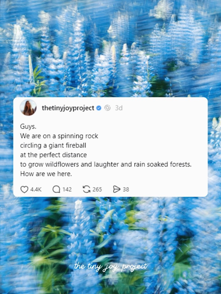 In honor of 12 years of daily posts about art and beauty and humor and cool stuff (and the occasional Etsy fail), I thought I’d share something truly uplifting. I stumbled upon Jasmine Wilder’s Tiny Joy Project in my new-and-improved Instagram feed*, and I knew it was something I had to share with you lovelies. Wilder describes it as “a soft, human corner of the internet for people who are a little drunk on being alive. The kind who look up at the sky and can’t believe they get to be here at all.”
