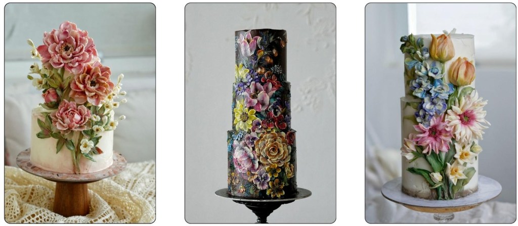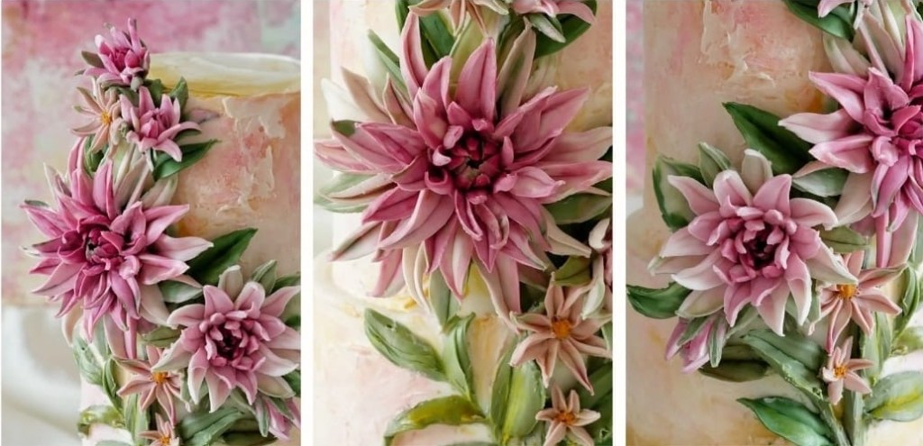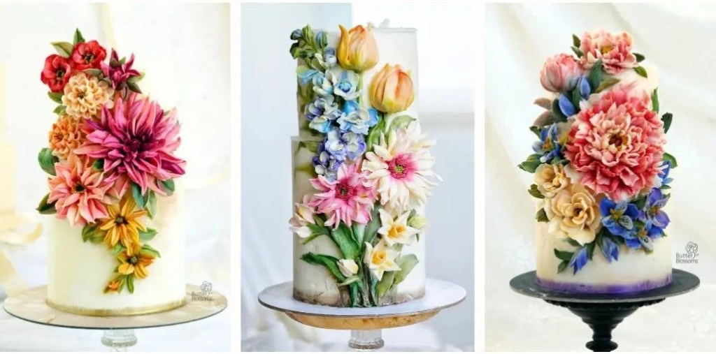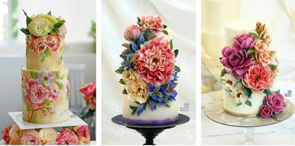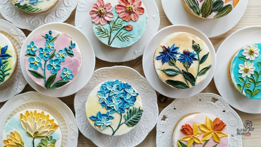 Today, we’re looking at the gorgeous, painterly cakes by the Bangkok, Thailand-based baker Tanaporn “Kwun” Vilailaks who works under the name Butter & Blossoms. The baker uses palette knife impasto paint techniques to create beautiful, 3D florals and other decorations on her cakes. And the generous Kwun is also a teacher, instructing both live and online classes in the art of buttercream painting.