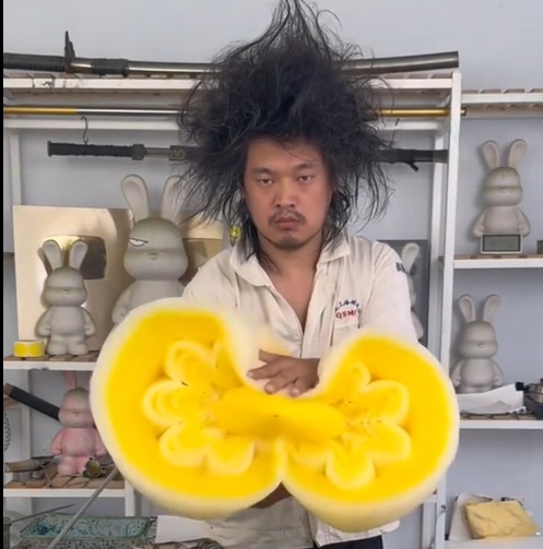Dad and food artist Tanggemianhuatang is well known for his wild cotton candy creations, all the while sporting some crazy Mr. Heat Miser hair. The notoriously-non-smiling Cotton Candy Guy makes enormous, delicate, complicated sculptures using just cotton candy, a pointy stick, and a very big knife. His art can more accurately be called cotton candy cutting. The Artist creates a giant, multi-layered, multi-colored ball which he then cuts and peels into fascinating floral shapes. His videos often also feature his kids doing their part. I assume their house is sticky all the time. There are also a number of videos on his social media feed of him cleaning his cotton candy machine, chipping away at the solidified sugar with a hilarious combination of tools. The third type of videos on his social media feed are what can only be called cotton candy stuff films. He and the kiddos take their amazing cotton candy creations and make us watch them dissolve into water. Those seem a little extra sad, but I guess how much cotton candy can one family really eat?