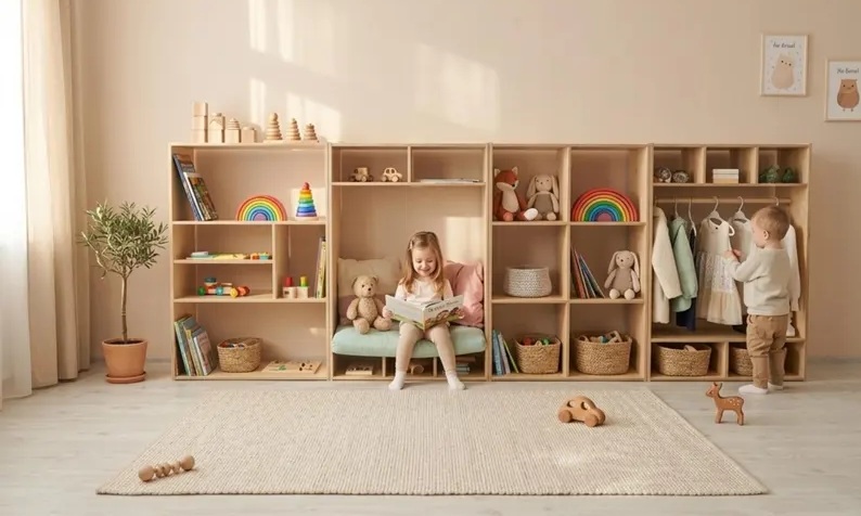 Charming toy storage, closet, & reading nook by SimreHomeLiving