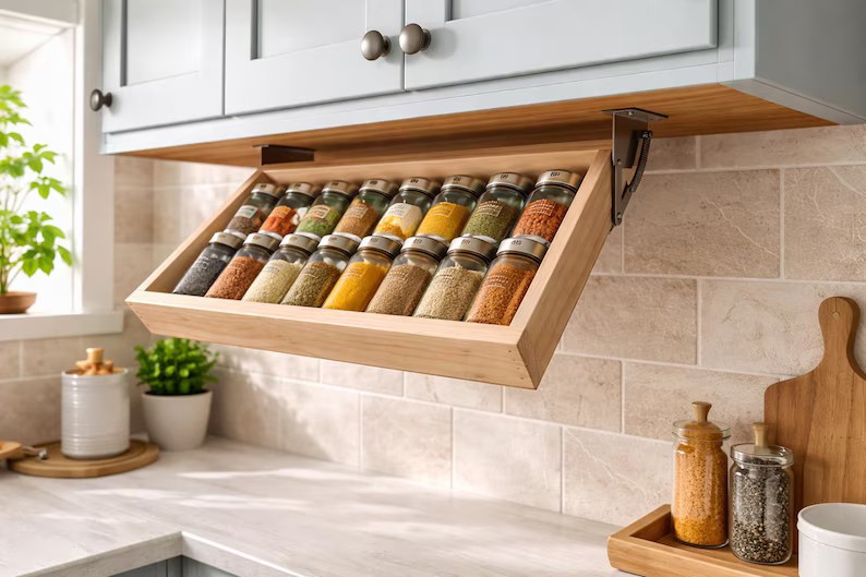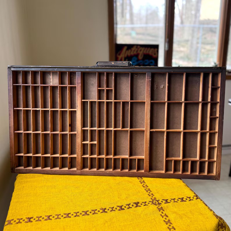 Let’s start with something that’s both gorgeous AND unaffordable! I have a real passion for jewelry storage, and this custom-made cabinet is making me weak in the knees. Look at the burl on that pepperwood! Its magnificence is surpassed only by its (justified) high price tag. By RosetteCustomFurnitu (I assume then ran out of letters)I am endlessly fascinated by vintage printer’s type drawers. I’ve seen them used in a number of interesting ways, and I’m always so tempted. Beloved also loves them but we have thus far resisted their charms because she knows I’d immediately use it as an excuse to shop for more tiny things… Sold by PinkOpossumAntiquesWinner of the “Because Etsy” prize is this junked-up and decidedly rude pill organizer.Get in touch with your inner Niles Crane with the most organized drawer organizers that ever organized! By HomeArtExclusiveI’m not sure how practical this book & magazine storage is, but I do like the look of them. By KeyaiiraIn case your desk job isn’t soul-sucking enough, here’s a “whimsical” pen holder to get you the rest of the way to a depression commercial.While not the most practical item here, we all know someone for whom this would be the perfect gift! By PrintifyMeoficialI love the look of these solid marble cord organizers, PLUS they’re too heavy for the cat to knock off… By LulucraftFindsAnd the winner in the “Things Nobody Needs” category is this bookmark organizer. <pause for eyeroll>I love the idea of this 20-arm folding laundry drying rack. When it’s not in use, it looks like art! By LionWoodenStoreWhat a great space saving device! This hidden spice rack folds down while taking up no counter or cabinet space! By AlansCreationsUSWall merkin, anyone? As storage, this “hanging wall organizer” is a fail. However, as far as style and design are concerned, it sucks even harder. While not technically an organizational tool, I have one of these blue crab pen holders, and I love him! By SevenLuckHorizonsChaotic as it is, I kind of love this transparent stuffie storage. By MasonGreyStudioBe still my heart! Yes, I know that in this 5′ x 5′ cabinet with more than 350 tiny drawers, I’d never find anything again, but oh, the fun I’d have looking! Sold by IndustrialArtifact in whose shop I plan on losing myself for the next few hours. Byeeeee…..
