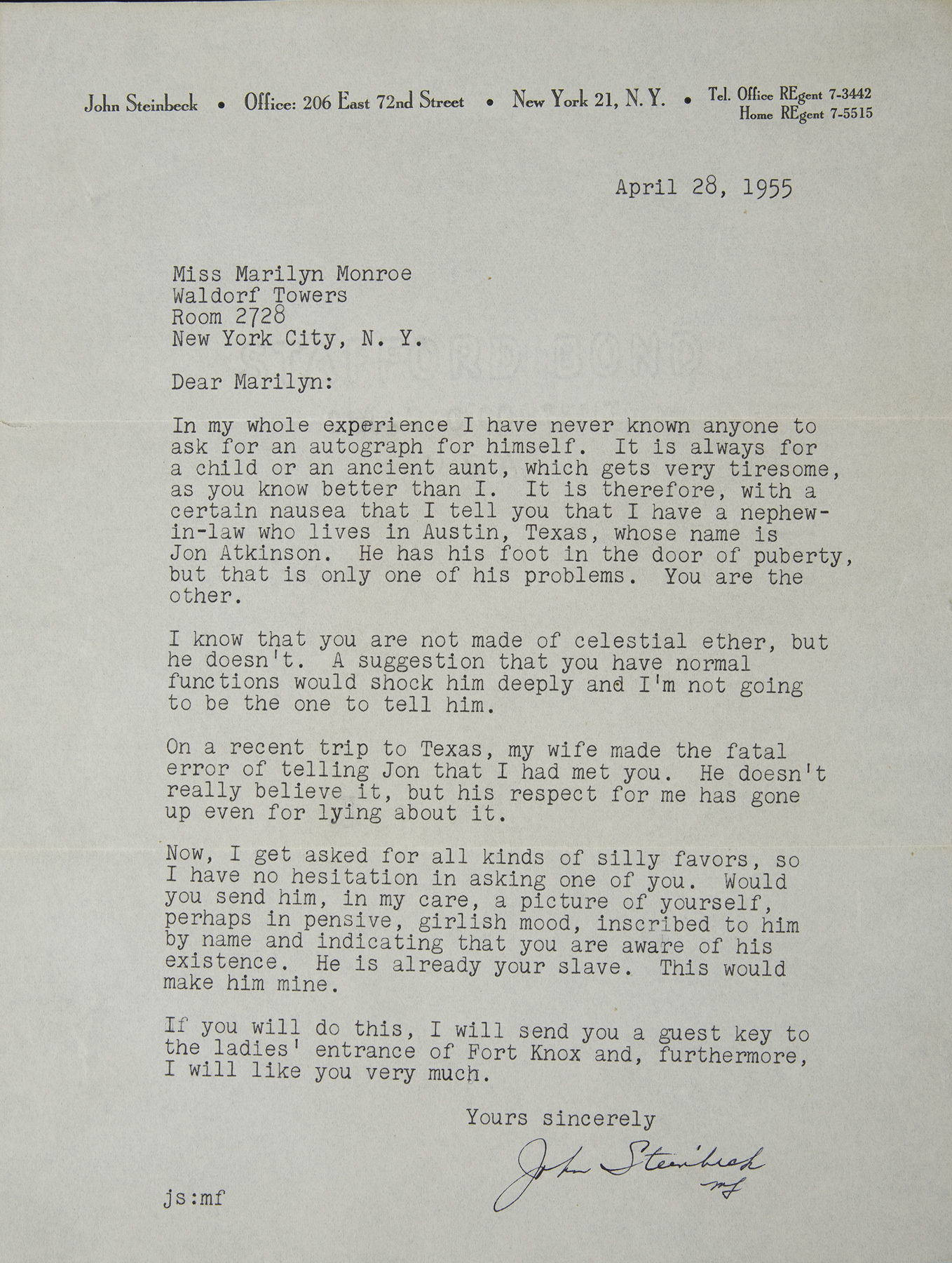 This amazing bit of history came across my desk today, and I was so enchanted, I couldn’t resist sharing it as a special bonus Friday afternoon treat. It’s very simply a letter from John Steinbeck to Marilyn Monroe asking for a signed photo, the kind of letter I’m sure she received daily by the thousands. But there’s something so genuine and charming and disarming about it, I think it’s really going to stick with me. Now, whenever I think of Steinbeck, this letter will pop up in my memory and make me smile.